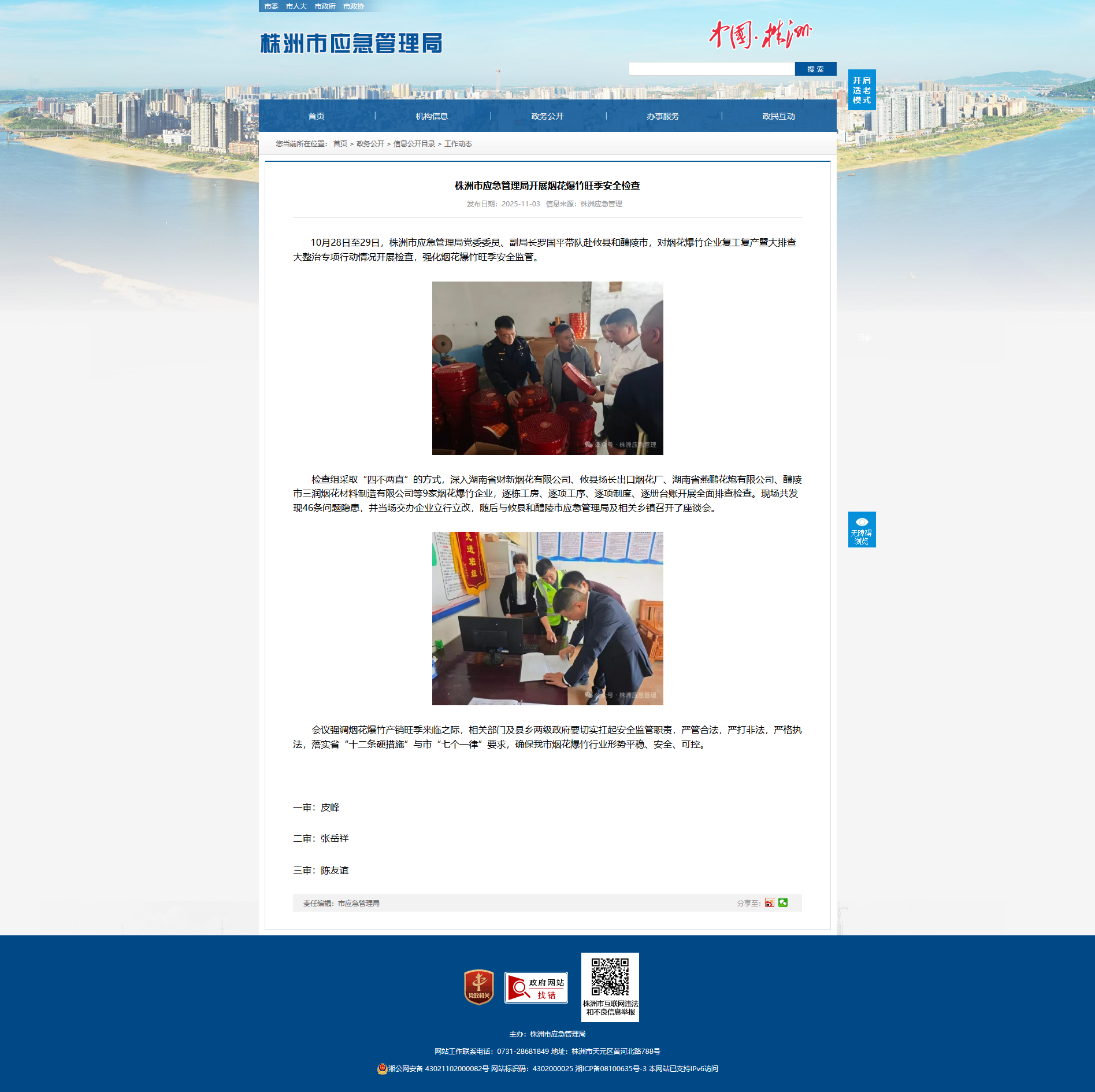 10月28日至29日,株洲市应急管理局党委委员、副局长罗国平带队赴攸县和醴陵市,对烟花爆竹企业复工复产暨大排查大整治专项行动情况开展检查,强化烟花爆竹旺季安全监管。