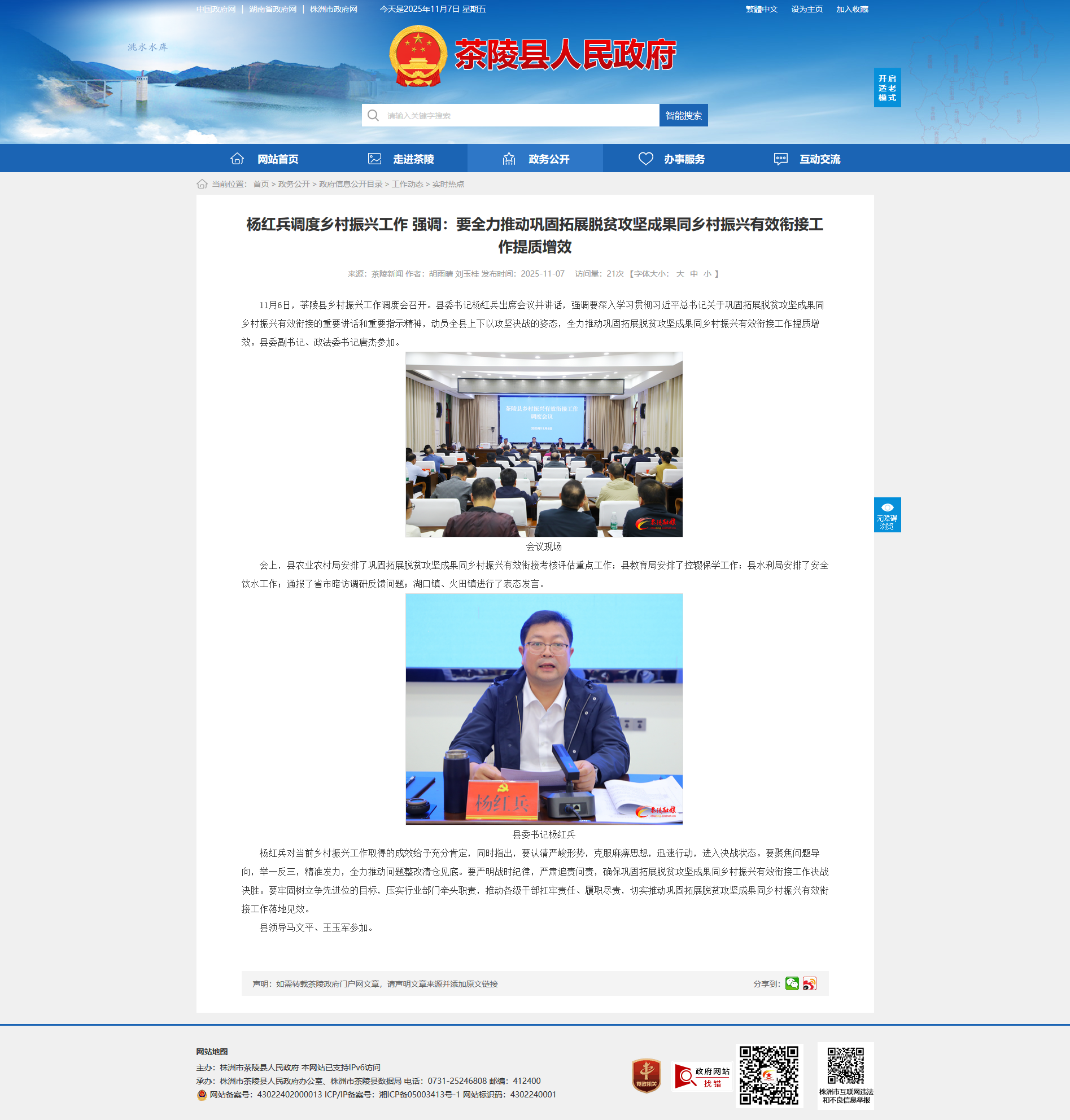 11月6日,茶陵县乡村振兴工作调度会召开。县委书记杨红兵出席会议并讲话,强调要深入学习贯彻习近平总书记关于巩固拓展脱贫攻坚成果同乡村振兴有效衔接的重要讲话和重要指示精神,动员全县上下以攻坚决战的姿态,全力推动巩固拓展脱贫攻坚成果同乡村振兴有效衔接工作提质增效。县委副书记、政法委书记唐杰参加。