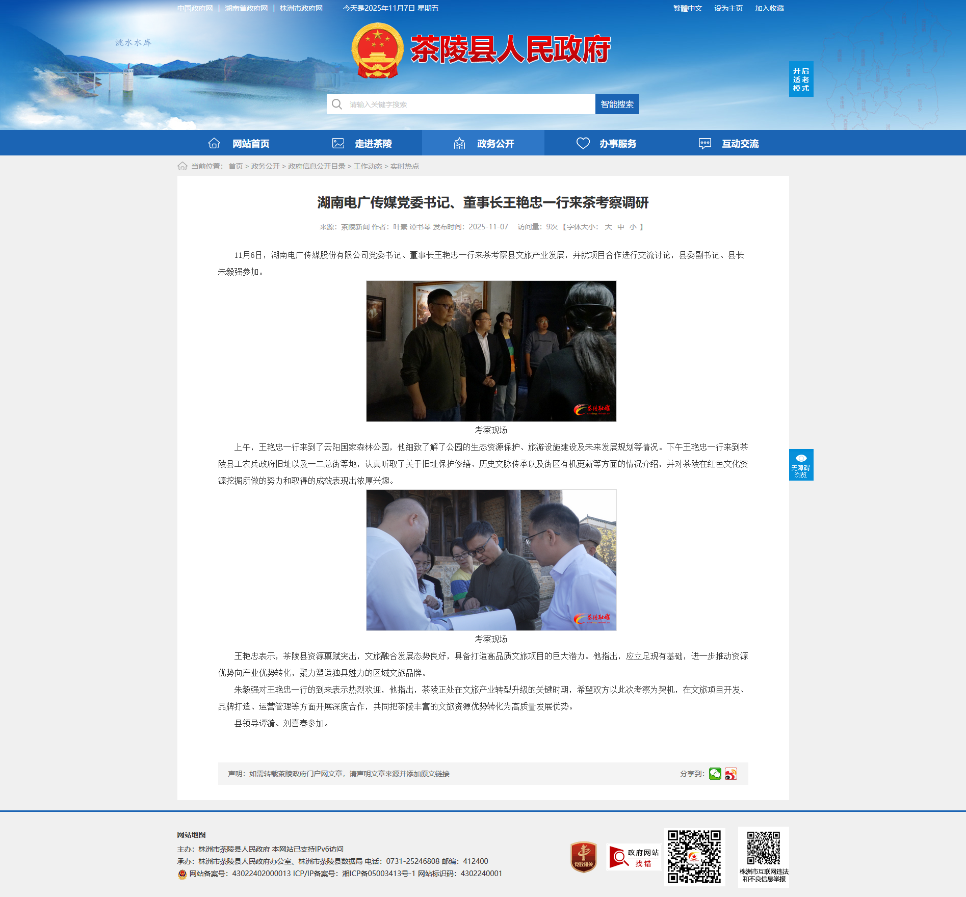 11月6日,湖南电广传媒股份有限公司党委书记、董事长王艳忠一行来茶考察县文旅产业发展,并就项目合作进行交流讨论,县委副书记、县长朱毅强参加。