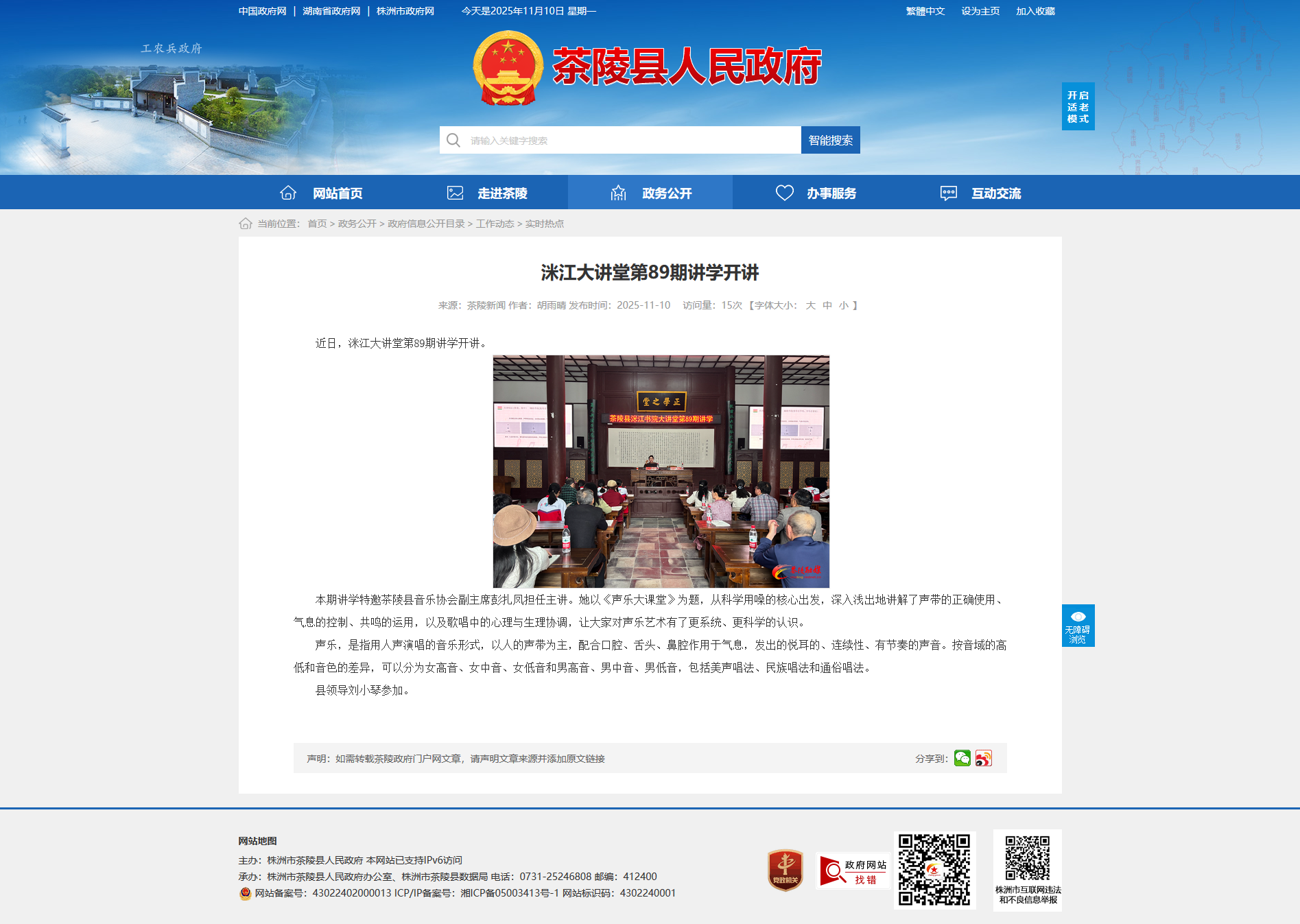 本期讲学特邀茶陵县音乐协会副主席彭扎凤担任主讲。她以《声乐大课堂》为题,从科学用嗓的核心出发,深入浅出地讲解了声带的正确使用、气息的控制、共鸣的运用,以及歌唱中的心理与生理协调,让大家对声乐艺术有了更系统、更科学的认识。