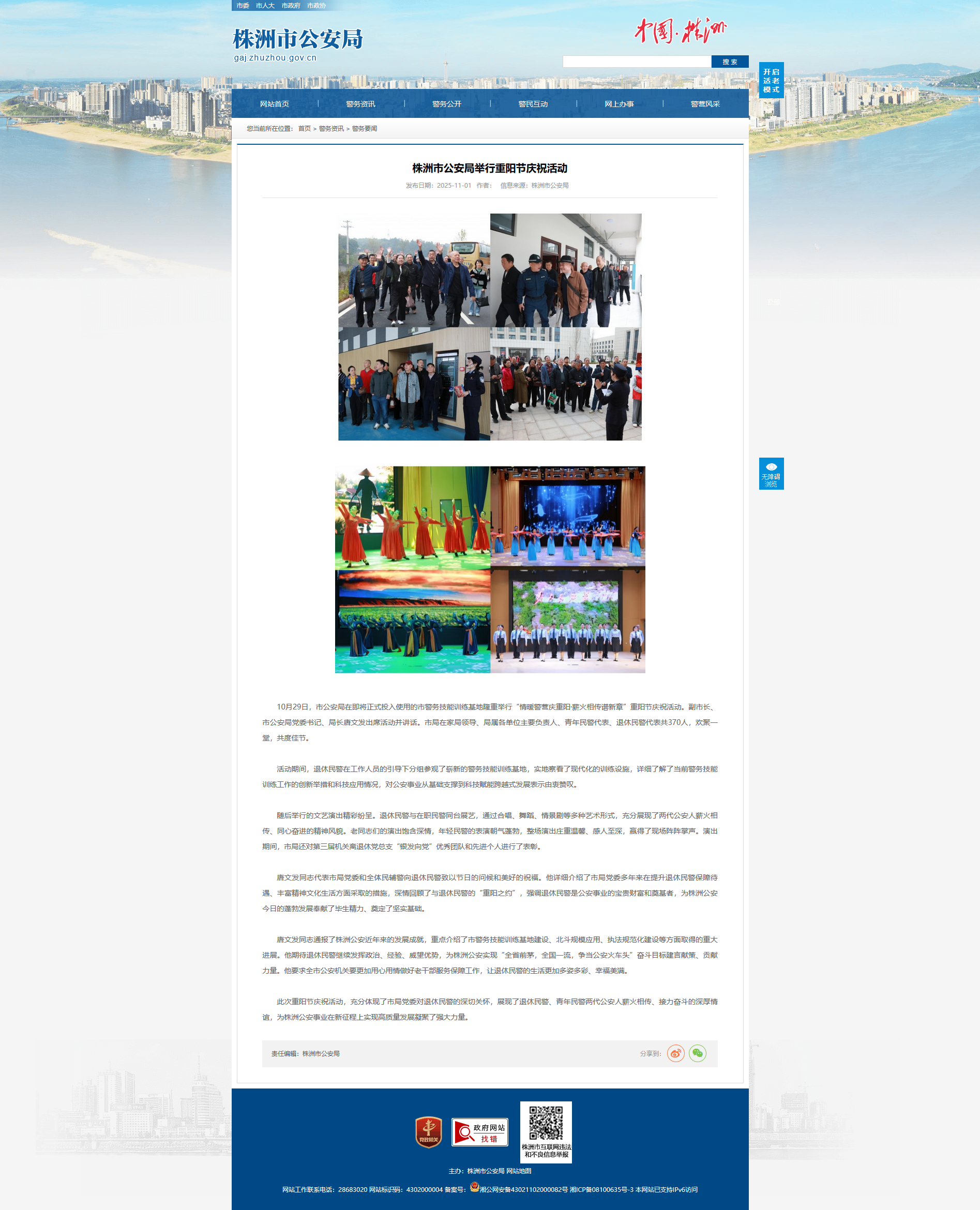 此次重阳节庆祝活动,充分体现了市局党委对退休民警的深切关怀,展现了退休民警、青年民警两代公安人薪火相传、接力奋斗的深厚情谊,为株洲公安事业在新征程上实现高质量发展凝聚了强大力量。
