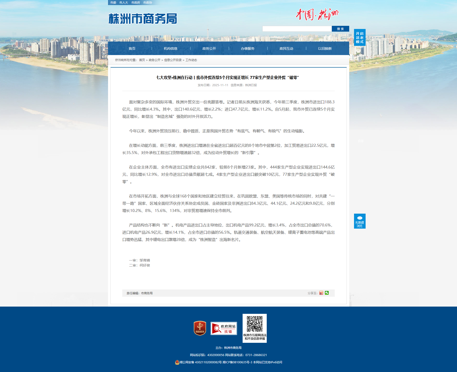 在增长动能方面,前三季度,株洲进出口增速在全省进出口超百亿元的8个地市中居第2位,加工贸易进出口22.5亿元,增长35.5%,对外承包工程出口货物增速超32倍,成为拉动外贸增长的“新引擎”。