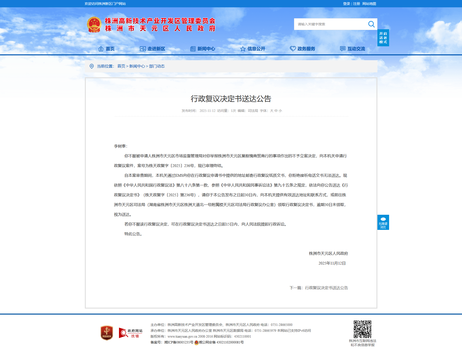 自本案审查期间,本机关通过EMS向你在行政复议申请书中提供的地址邮寄行政复议纸质文书,你拒绝接听电话文书无法送达。现依照《中华人民共和国行政复议法》第八十八条第一款、参照《中华人民共和国民事诉讼法》第九十五条之规定,依法向你公告送达《行政复议决定书》(株天政复字〔2025〕第236号),请你于本公告发布之日起30日内,向本机关提供有效送达地址和联系方式,或前往株洲市天元区司法局(湖南省株洲市天元区株洲大道北一号附属楼天元区司法局行政复议办公室)领取行政复议决定书,逾期30日未领取,视为送达。