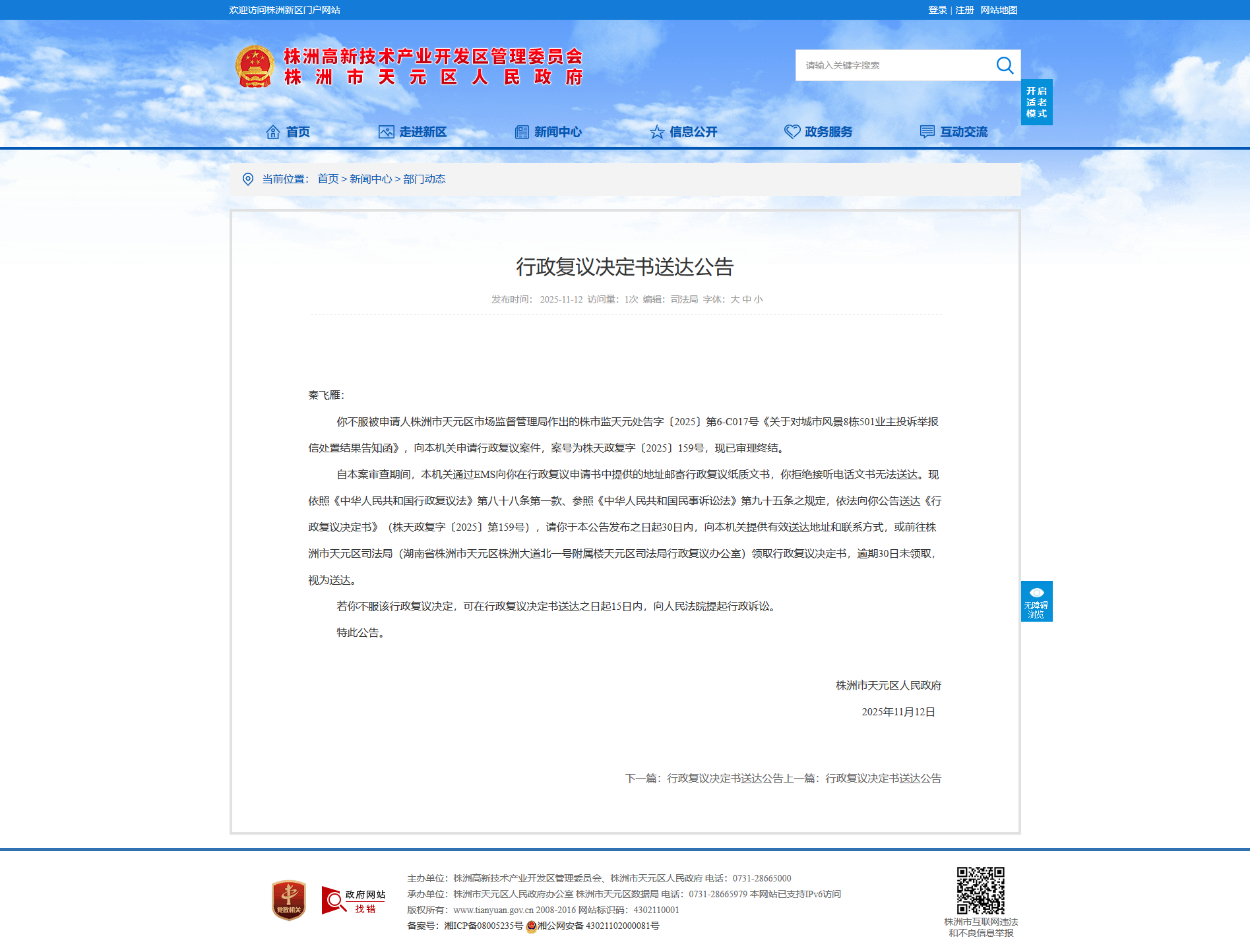 自本案审查期间,本机关通过EMS向你在行政复议申请书中提供的地址邮寄行政复议纸质文书,你拒绝接听电话文书无法送达。现依照《中华人民共和国行政复议法》第八十八条第一款、参照《中华人民共和国民事诉讼法》第九十五条之规定,依法向你公告送达《行政复议决定书》(株天政复字〔2025〕第159号),请你于本公告发布之日起30日内,向本机关提供有效送达地址和联系方式,或前往株洲市天元区司法局(湖南省株洲市天元区株洲大道北一号附属楼天元区司法局行政复议办公室)领取行政复议决定书,逾期30日未领取,视为送达。