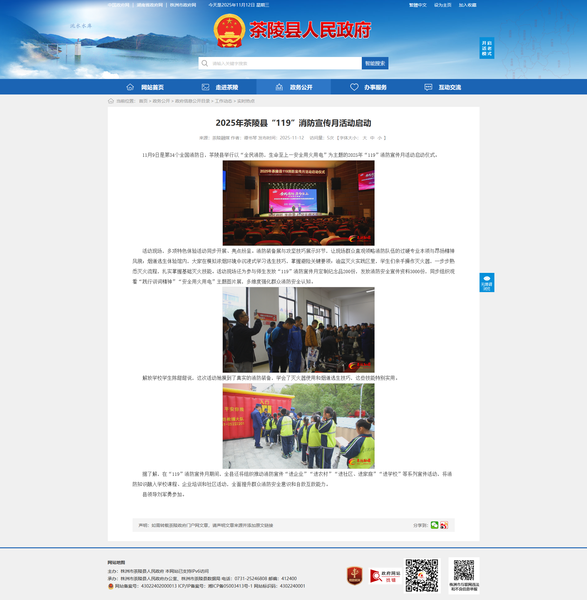 11月9日是第34个全国消防日,茶陵县举行以“全民消防,生命至上—安全用火用电”为主题的2025年“119”消防宣传月活动启动仪式。