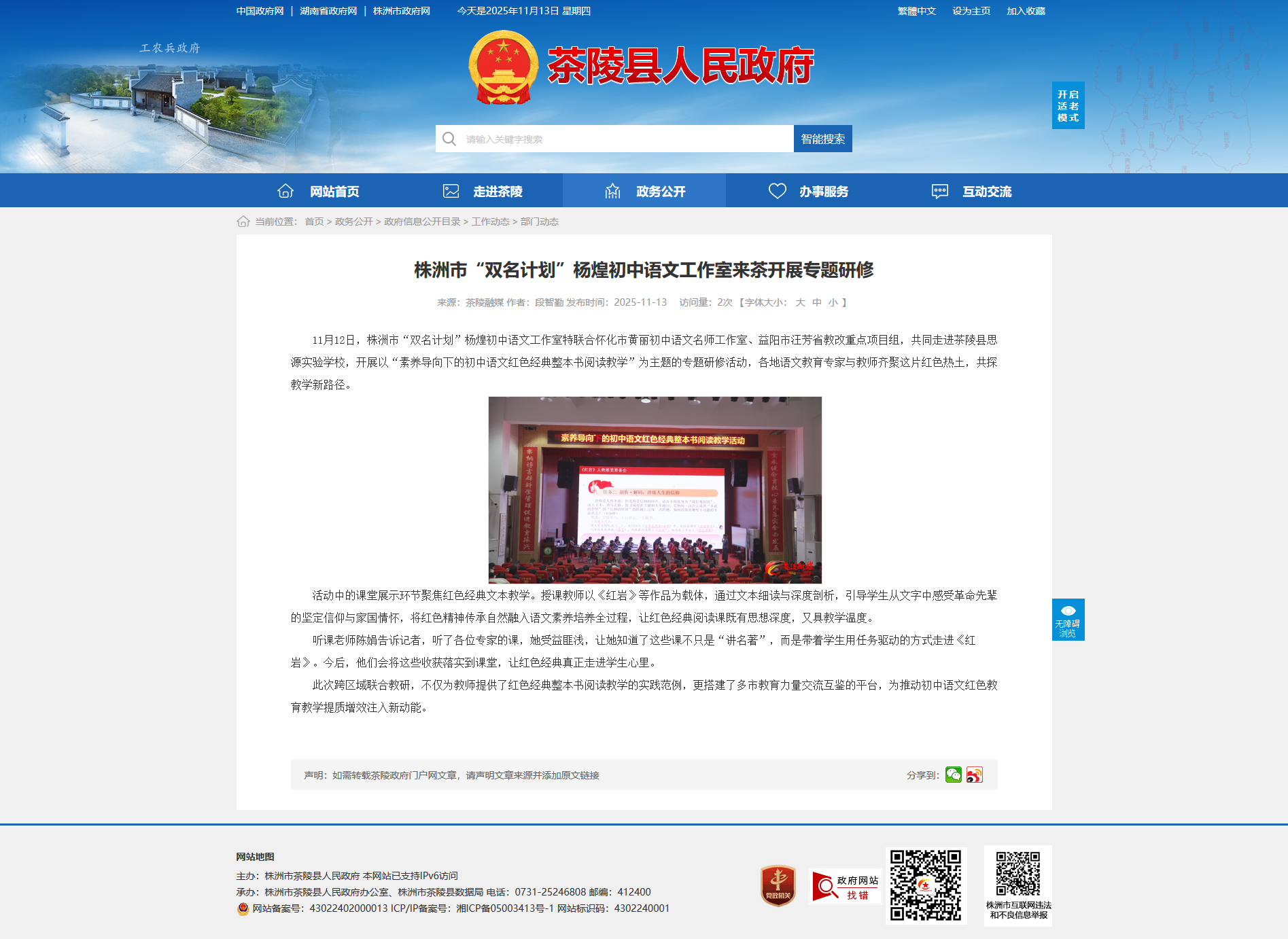 11月12日,株洲市“双名计划”杨煌初中语文工作室特联合怀化市黄丽初中语文名师工作室、益阳市汪芳省教改重点项目组,共同走进茶陵县思源实验学校,开展以“素养导向下的初中语文红色经典整本书阅读教学”为主题的专题研修活动,各地语文教育专家与教师齐聚这片红色热土,共探教学新路径。