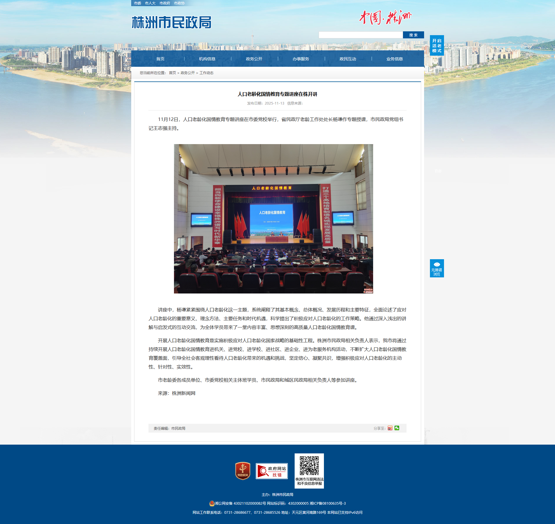 11月12日,人口老龄化国情教育专题讲座在市委党校举行,省民政厅老龄工作处处长杨谦作专题授课,市民政局党组书记王志强主持。