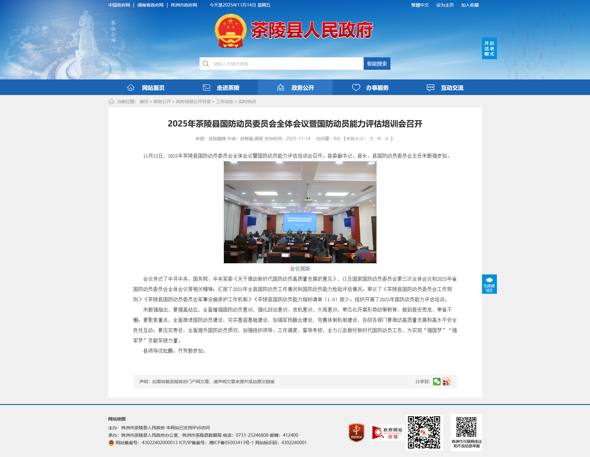 会议传达了中共中央、国务院、中央军委《关于推动新时代国防动员高质量发展的意见》,以及国家国防动员委员会第三次全体会议和2025年省国防动员委员会全体会议等相关精神;汇报了2025年全县国防动员工作情况和国防动员能力检验评估情况;审议了《茶陵县国防动员委员会工作规则》《茶陵县国防动员委员会军事设施保护工作机制》《茶陵县国防动员能力指标清单(1.0)版》;组织开展了2025年国防动员能力评估培训。