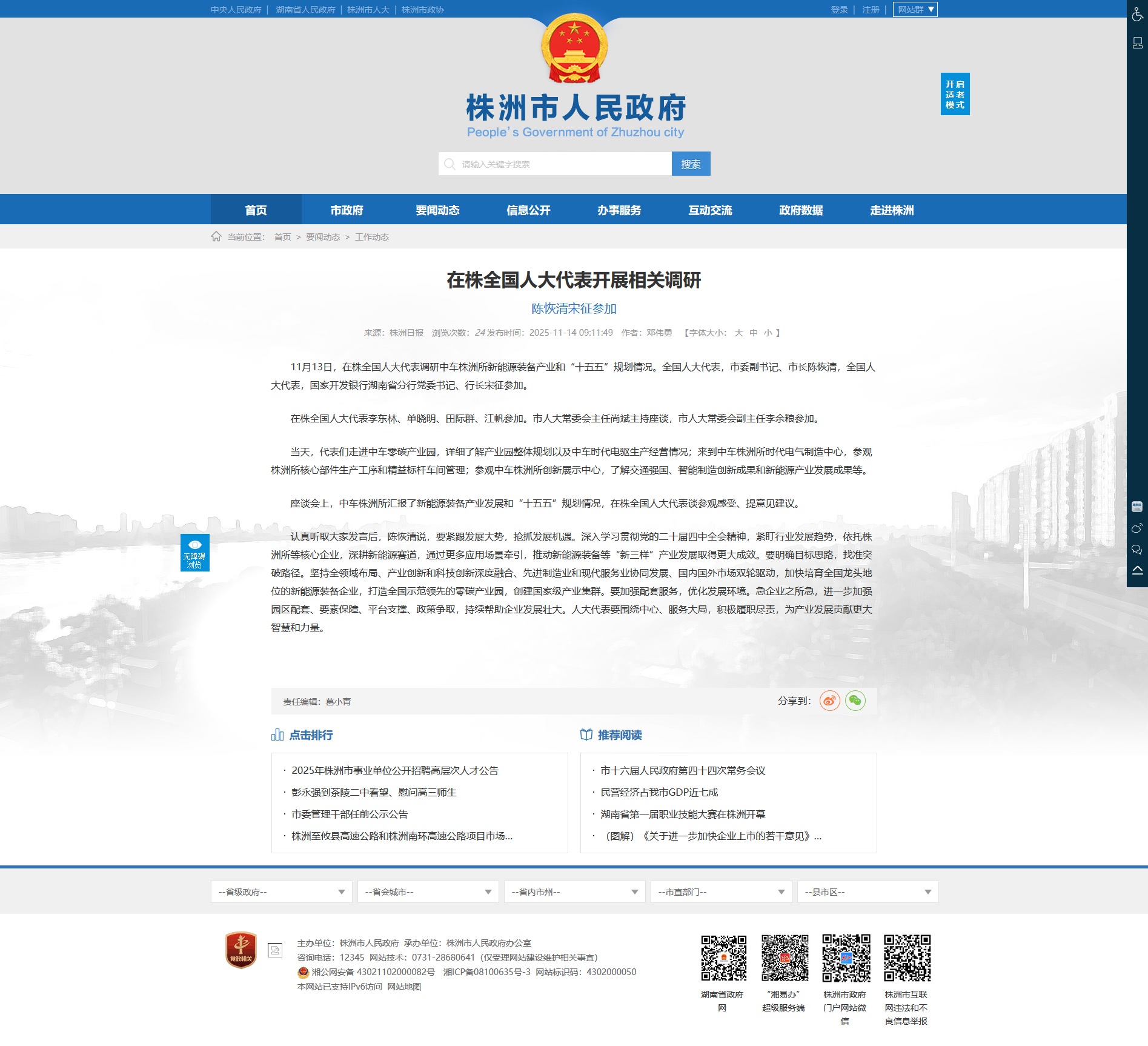 11月13日,在株全国人大代表调研中车株洲所新能源装备产业和“十五五”规划情况。全国人大代表,市委副书记、市长陈恢清,全国人大代表,国家开发银行湖南省分行党委书记、行长宋征参加。