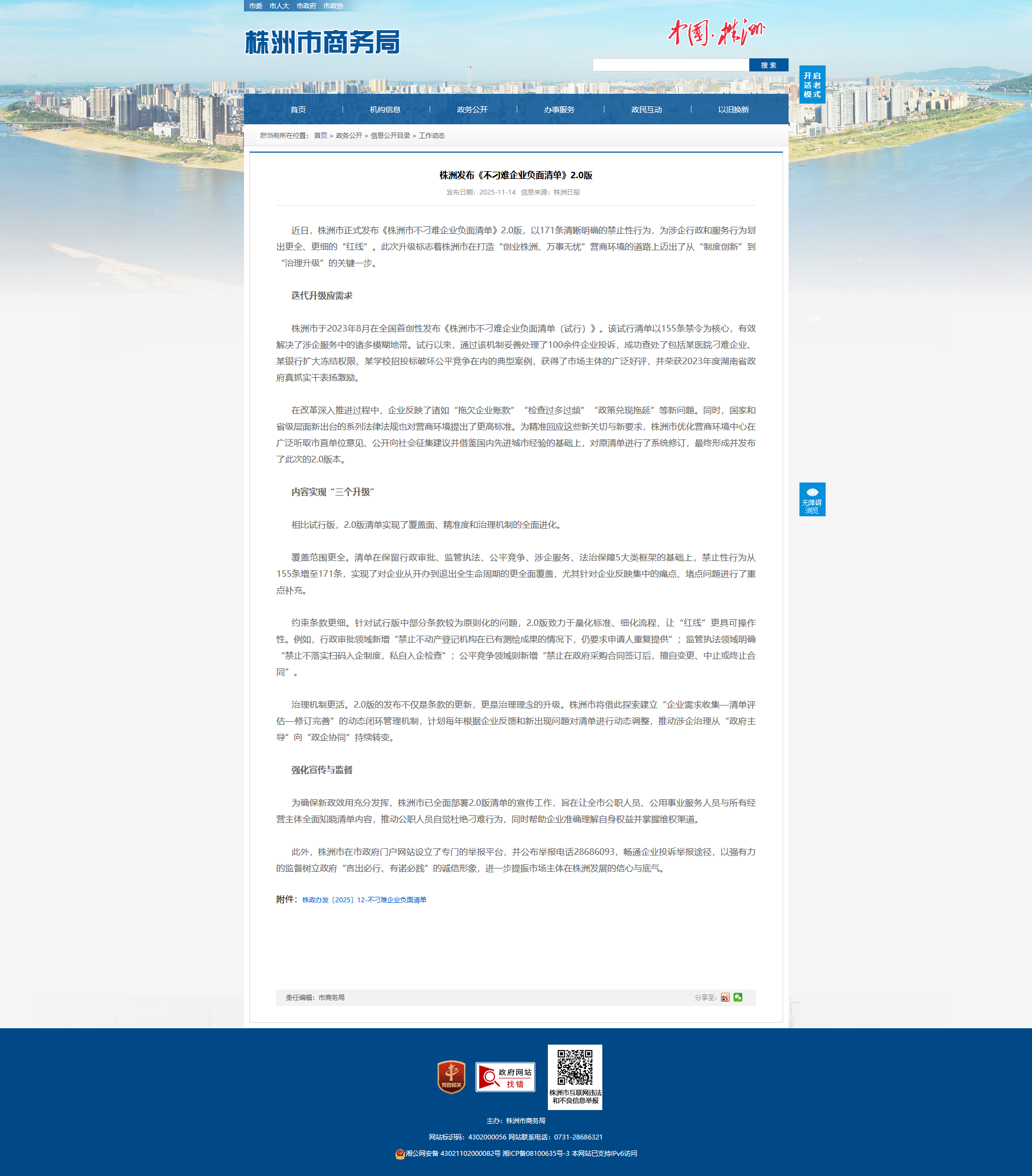 近日,株洲市正式发布《株洲市不刁难企业负面清单》2.0版,以171条清晰明确的禁止性行为,为涉企行政和服务行为划出更全、更细的“红线”。此次升级标志着株洲市在打造“创业株洲、万事无忧”营商环境的道路上迈出了从“制度创新”到“治理升级”的关键一步。