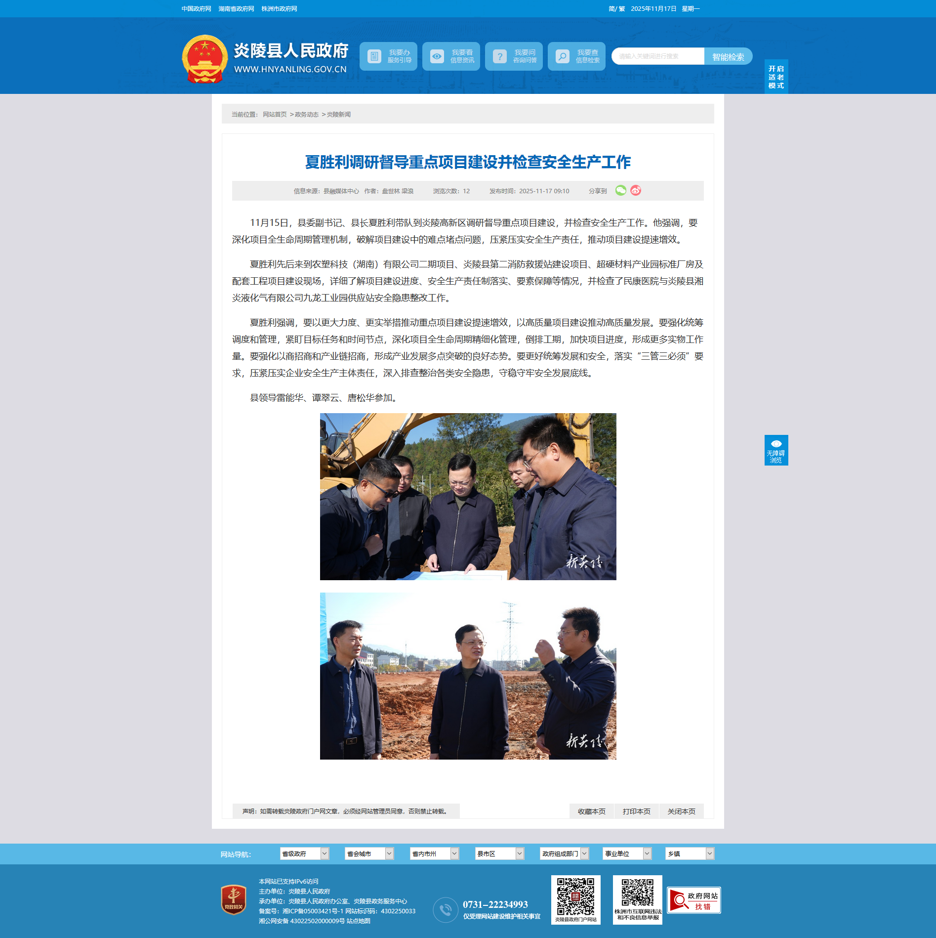 11月15日,县委副书记、县长夏胜利带队到炎陵高新区调研督导重点项目建设,并检查安全生产工作。他强调,要深化项目全生命周期管理机制,破解项目建设中的难点堵点问题,压紧压实安全生产责任,推动项目建设提速增效。
