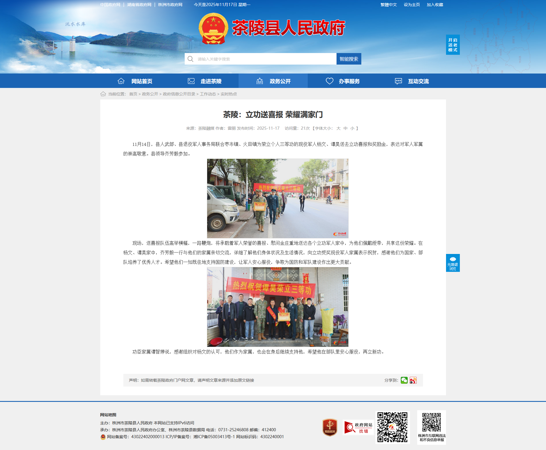 11月14日,县人武部、县退役军人事务局联合枣市镇、火田镇为荣立个人三等功的现役军人杨文、谭昊送去立功喜报和奖励金,表达对军人军属的崇高敬意。县领导齐芳毅参加。