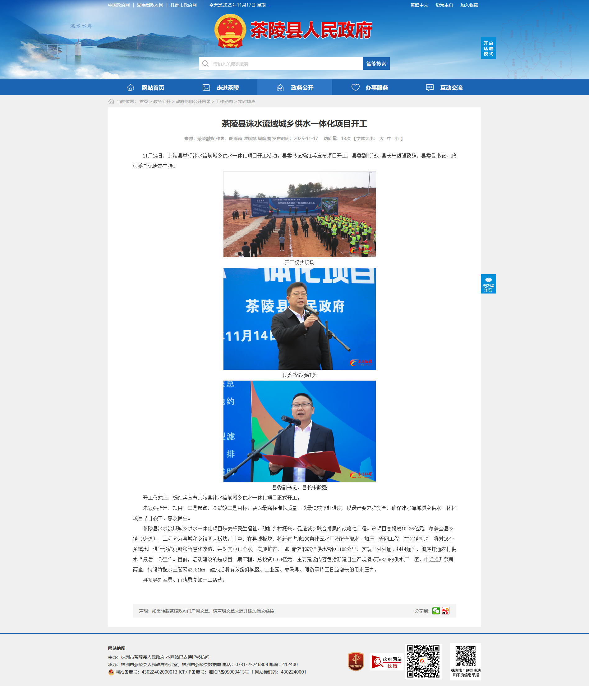 11月14日,茶陵县举行洣水流域城乡供水一体化项目开工活动。县委书记杨红兵宣布项目开工,县委副书记、县长朱毅强致辞,县委副书记、政法委书记唐杰主持。