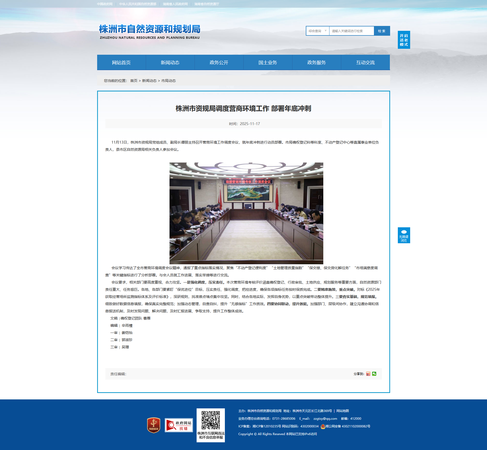 11月13日,株洲市资规局党组成员、副局长谭丽主持召开营商环境工作调度会议,就年底冲刺进行动员部署。市局确权登记科等科室、不动产登记中心等直属事业单位负责人,县市区自然资源局相关负责人参加会议。
