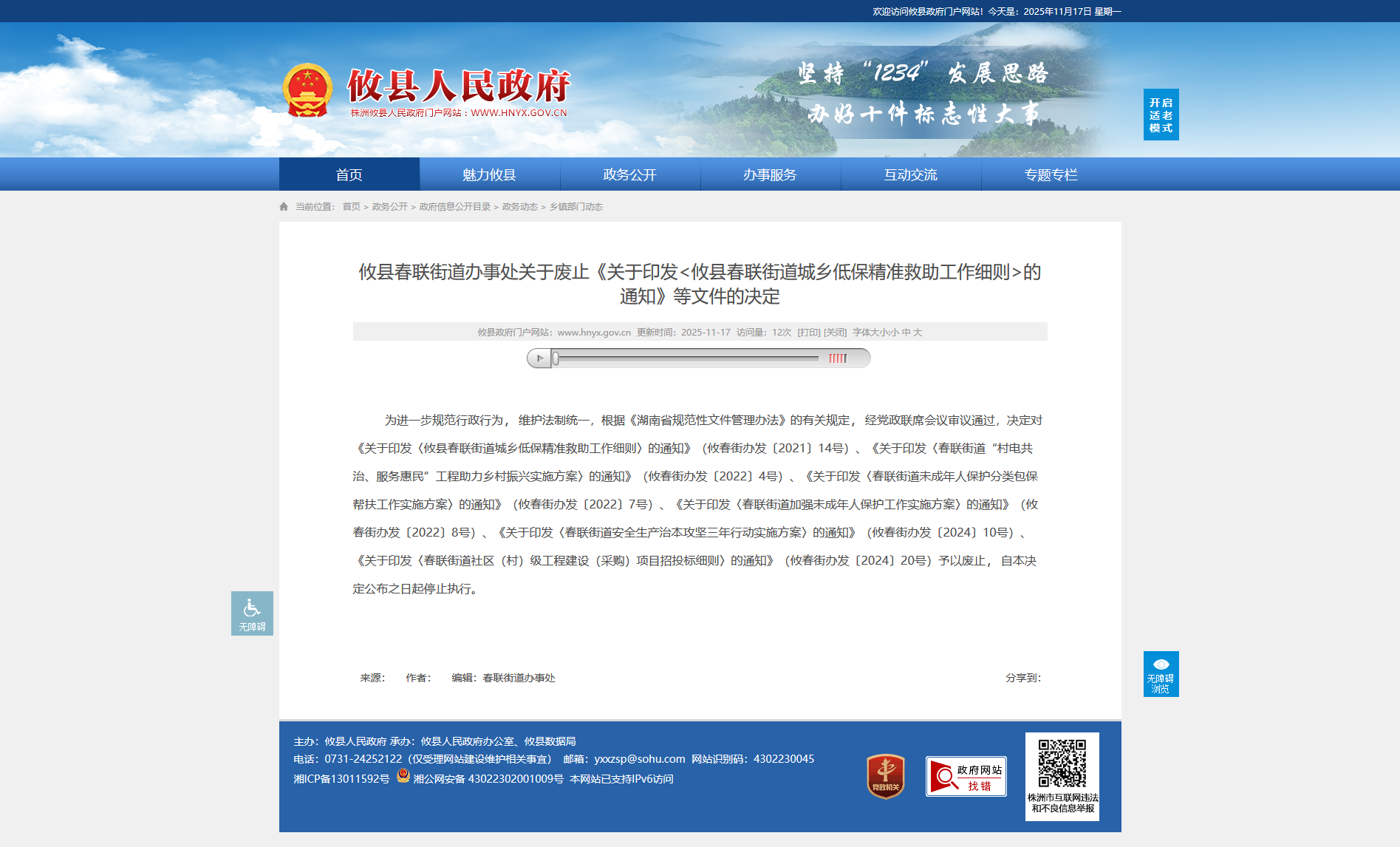 为进一步规范行政行为,维护法制统一,根据《湖南省规范性文件管理办法》的有关规定,经党政联席会议审议通过,决定对《关于印发〈攸县春联街道城乡低保精准救助工作细则〉的通知》(攸春街办发〔2021〕14号)、《关于印发〈春联街道“村电共治、服务惠民”工程助力乡村振兴实施方案〉的通知》(攸春街办发〔2022〕4号)、《关于印发〈春联街道未成年人保护分类包保帮扶工作实施方案〉的通知》(攸春街办发〔2022〕7号)、《关于印发〈春联街道加强未成年人保护工作实施方案〉的通知》(攸春街办发〔2022〕8号)、《关于印发〈春联街道安全生产治本攻坚三年行动实施方案〉的通知》(攸春街办发〔2024〕10号)、《关于印发〈春联街道社区(村)级工程建设(采购)项目招投标细则〉的通知》(攸春街办发〔2024〕20号)予以废止,自本决定公布之日起停止执行。
