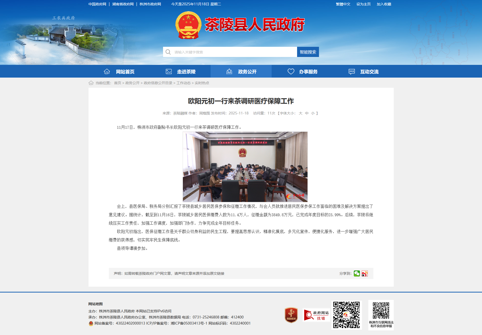 11月17日,株洲市政府副秘书长欧阳元初一行来茶调研医疗保障工作。