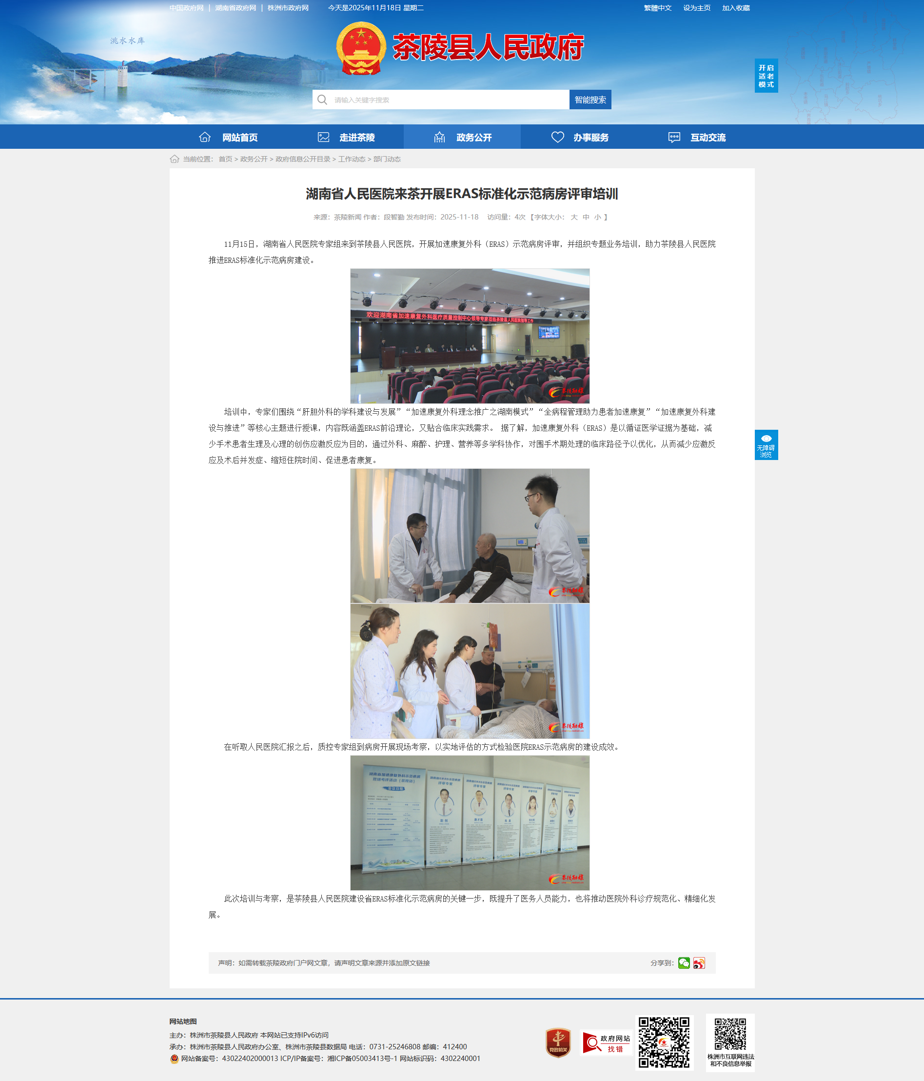11月15日,湖南省人民医院专家组来到茶陵县人民医院,开展加速康复外科(ERAS)示范病房评审,并组织专题业务培训,助力茶陵县人民医院推进ERAS标准化示范病房建设。