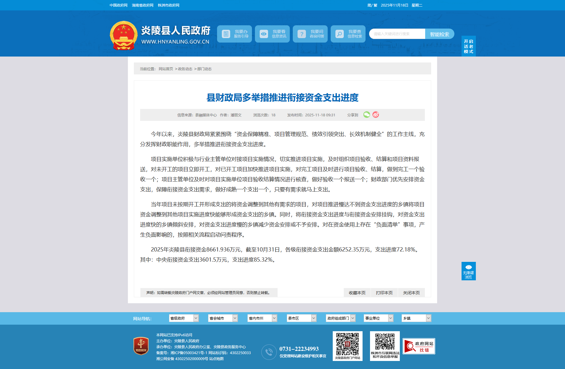 2025年炎陵县衔接资金8661.936万元,截至10月31日,各级衔接资金支出金额6252.35万元,支出进度72.18%。其中:中央衔接资金支出3601.5万元,支出进度85.32%。
