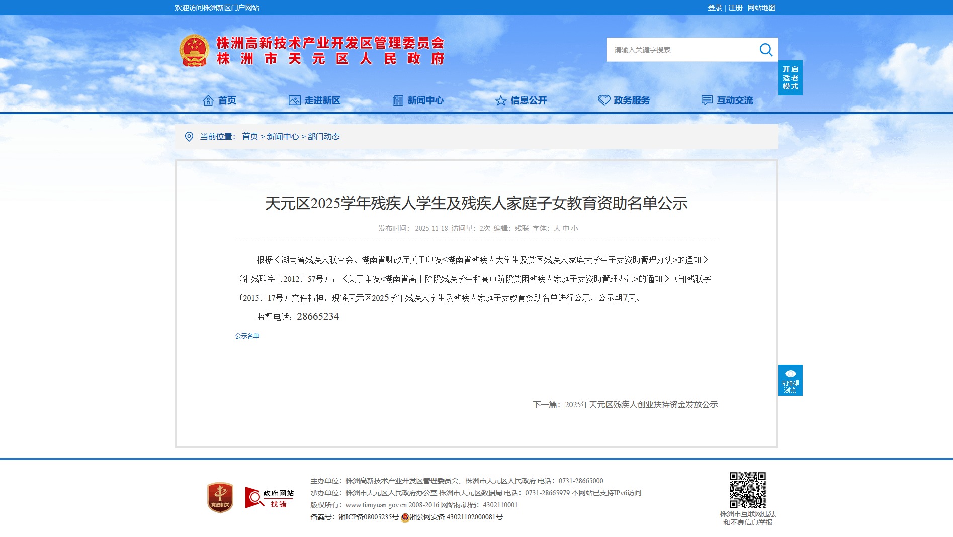 根据《湖南省残疾人联合会、湖南省财政厅关于印发<湖南省残疾人大学生及贫困残疾人家庭大学生子女资助管理办法>的通知》(湘残联字〔2012〕57号);《关于印发<湖南省高中阶段残疾学生和高中阶段贫困残疾人家庭子女资助管理办法>的通知》(湘残联字〔2015〕17号)文件精神,现将天元区2025学年残疾人学生及残疾人家庭子女教育资助名单进行公示,公示期7天。