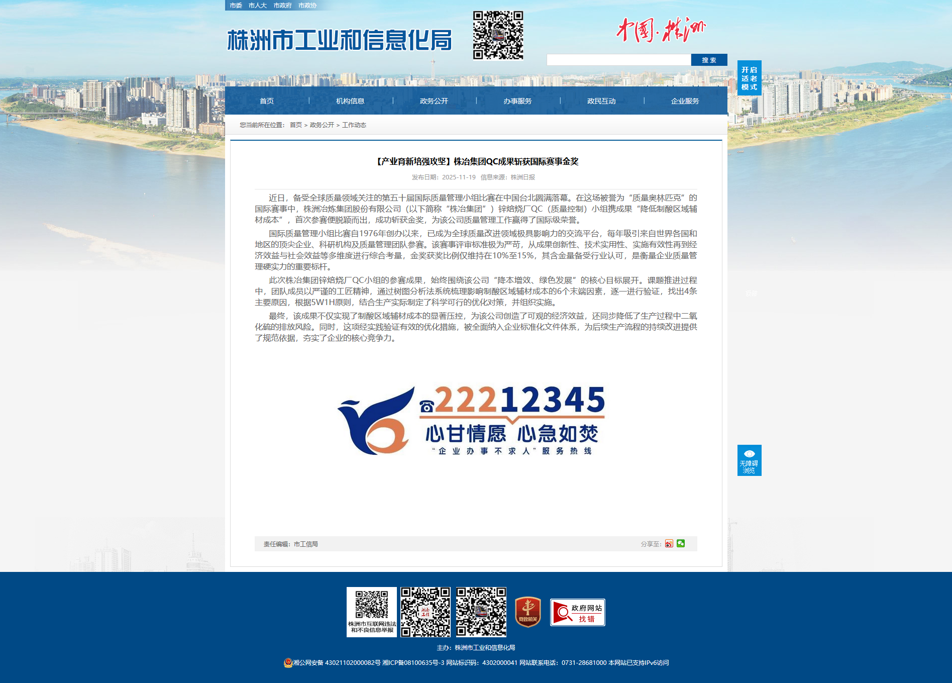 近日,备受全球质量领域关注的第五十届国际质量管理小组比赛在中国台北圆满落幕。在这场被誉为“质量奥林匹克”的国际赛事中,株洲冶炼集团股份有限公司(以下简称“株冶集团”)锌焙烧厂QC(质量控制)小组携成果“降低制酸区域辅材成本”,首次参赛便脱颖而出,成功斩获金奖,为该公司质量管理工作赢得了国际级荣誉。