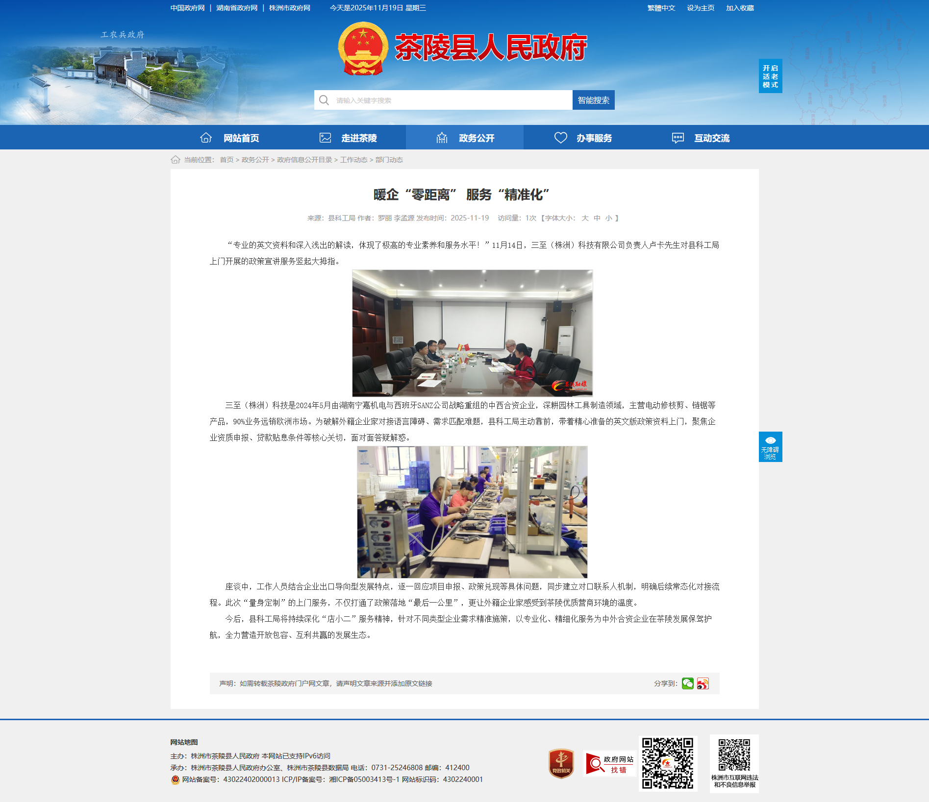 三至(株洲)科技是2024年5月由湖南宁嘉机电与西班牙SANZ公司战略重组的中西合资企业,深耕园林工具制造领域,主营电动修枝剪、链锯等产品,90%业务远销欧洲市场。为破解外籍企业家对接语言障碍、需求匹配难题,县科工局主动靠前,带着精心准备的英文版政策资料上门,聚焦企业资质申报、贷款贴息条件等核心关切,面对面答疑解惑。