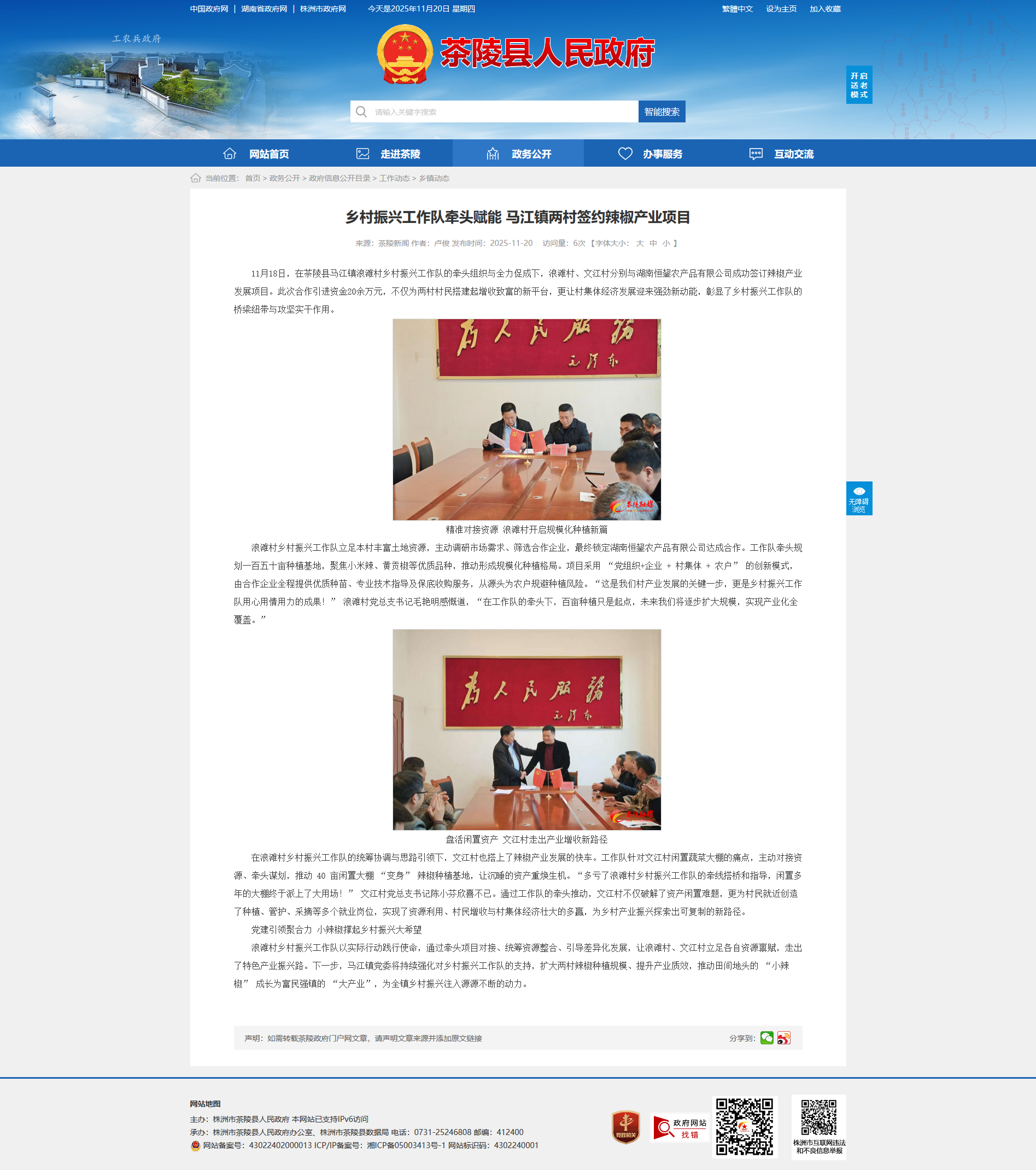 11月18日,在茶陵县马江镇浪滩村乡村振兴工作队的牵头组织与全力促成下,浪滩村、文江村分别与湖南恒鋆农产品有限公司成功签订辣椒产业发展项目。此次合作引进资金20余万元,不仅为两村村民搭建起增收致富的新平台,更让村集体经济发展迎来强劲新动能,彰显了乡村振兴工作队的桥梁纽带与攻坚实干作用。