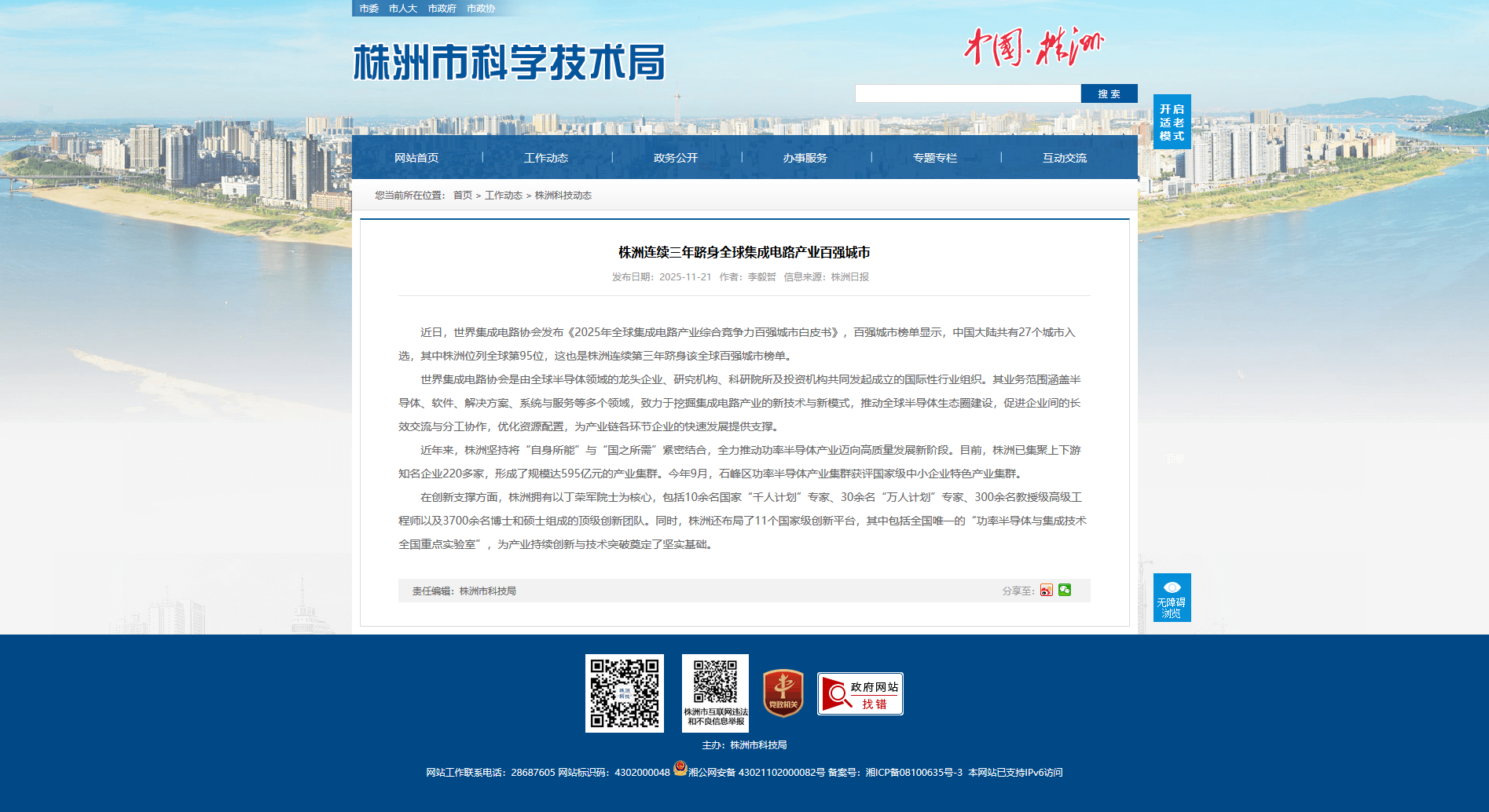 近日,世界集成电路协会发布《2025年全球集成电路产业综合竞争力百强城市白皮书》,百强城市榜单显示,中国大陆共有27个城市入选,其中株洲位列全球第95位,这也是株洲连续第三年跻身该全球百强城市榜单。