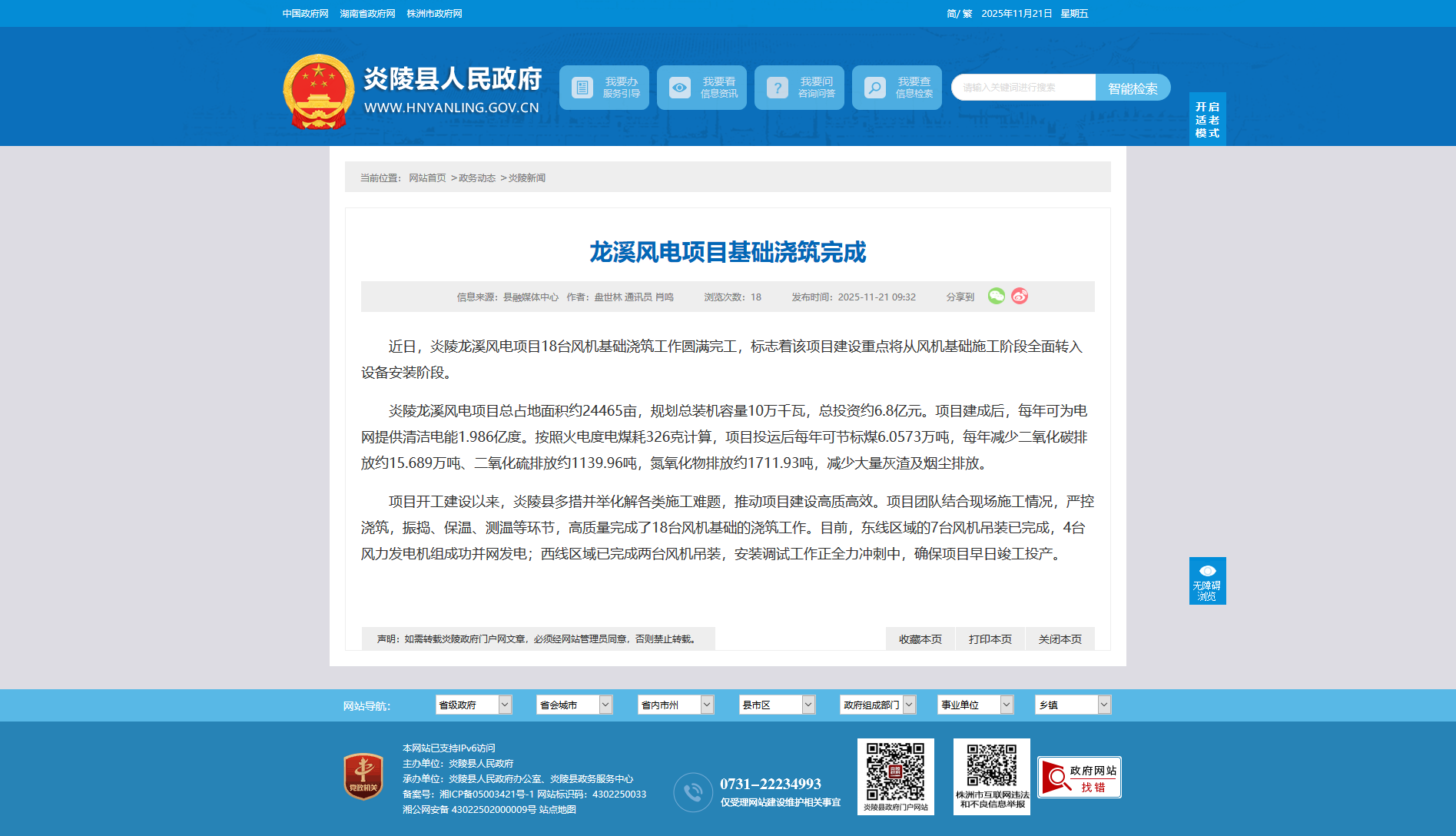 炎陵龙溪风电项目总占地面积约24465亩,规划总装机容量10万千瓦,总投资约6.8亿元。项目建成后,每年可为电网提供清洁电能1.986亿度。按照火电度电煤耗326克计算,项目投运后每年可节标煤6.0573万吨,每年减少二氧化碳排放约15.689万吨、二氧化硫排放约1139.96吨,氮氧化物排放约1711.93吨,减少大量灰渣及烟尘排放。