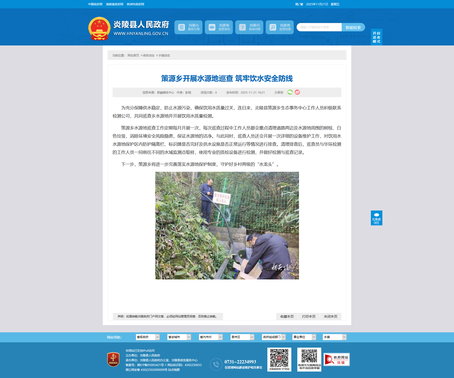为充分保障供水稳定,防止水源污染,确保饮用水质量过关,连日来,炎陵县策源乡生态事务中心工作人员积极联系检测公司,共同巡查乡水源地并开展饮用水质量检测。