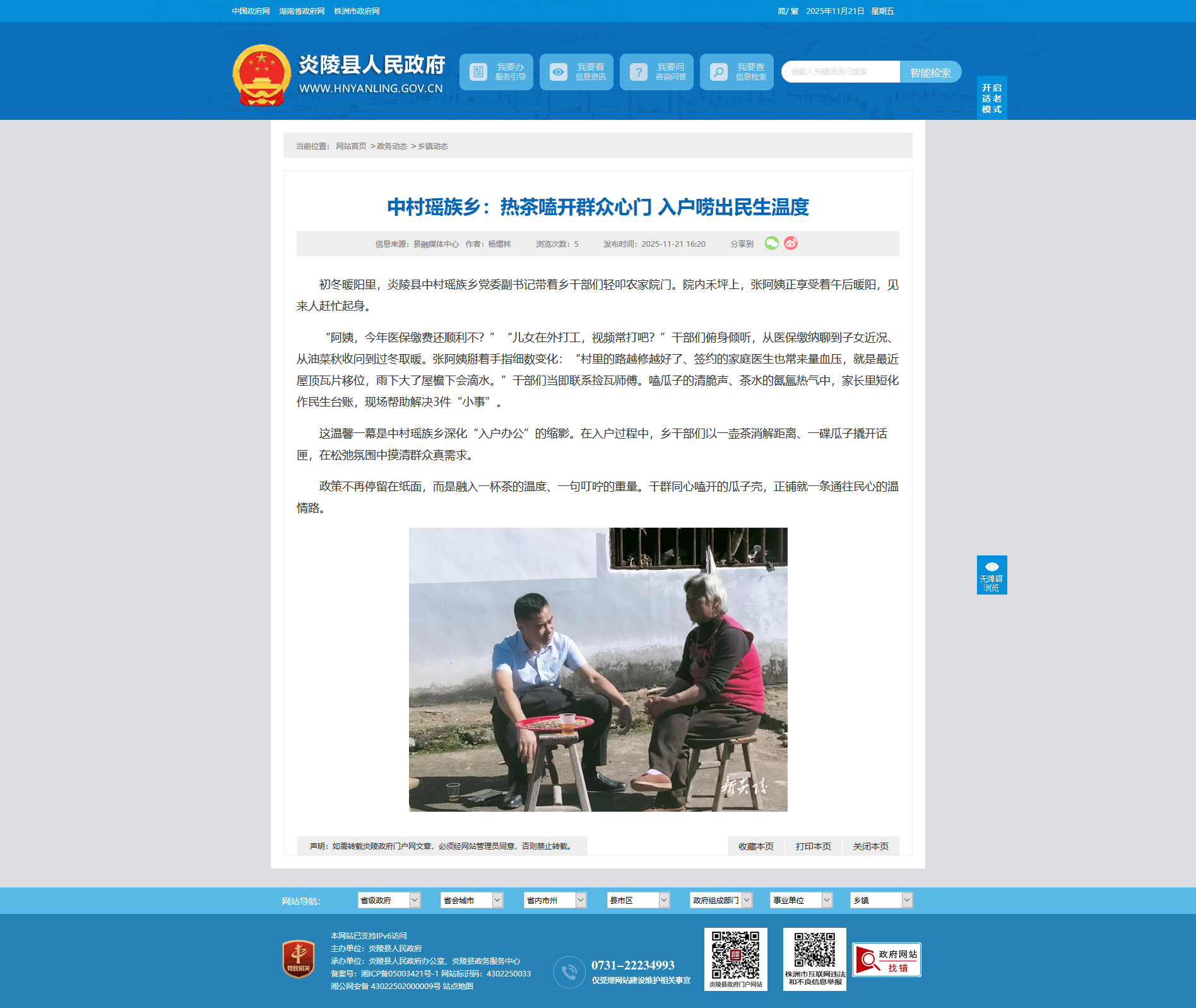 初冬暖阳里,炎陵县中村瑶族乡党委副书记带着乡干部们轻叩农家院门。院内禾坪上,张阿姨正享受着午后暖阳,见来人赶忙起身。