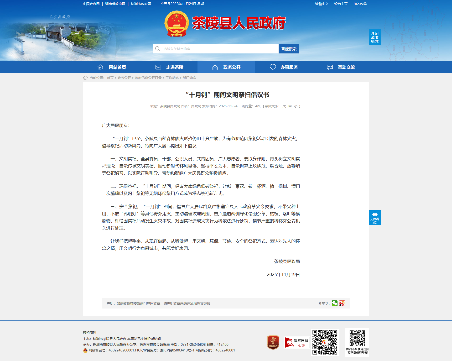 “十月钊”已至,茶陵县当前森林防火形势仍旧十分严峻,为有效防范因祭祀活动引发的森林火灾,倡导祭祀活动新风尚,特向广大居民提出如下倡议: