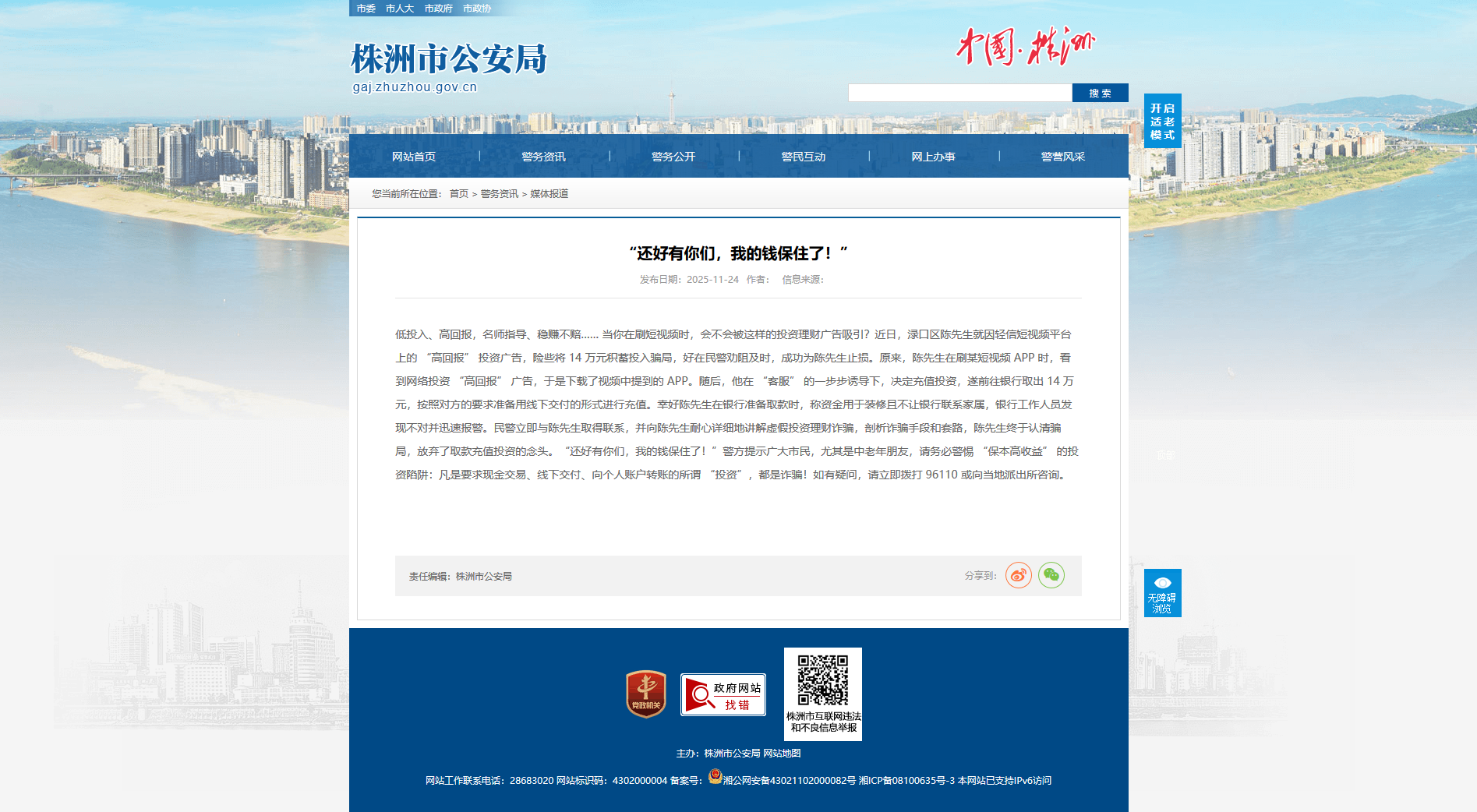 低投入、高回报,名师指导、稳赚不赔…… 当你在刷短视频时,会不会被这样的投资理财广告吸引?近日,渌口区陈先生就因轻信短视频平台上的 “高回报” 投资广告,险些将 14 万元积蓄投入骗局,好在民警劝阻及时,成功为陈先生止损。原来,陈先生在刷某短视频 APP 时,看到网络投资 “高回报” 广告,于是下载了视频中提到的 APP。随后,他在 “客服” 的一步步诱导下,决定充值投资,遂前往银行取出 14 万元,按照对方的要求准备用线下交付的形式进行充值。幸好陈先生在银行准备取款时,称资金用于装修且不让银行联系家属,银行工作人员发现不对并迅速报警。民警立即与陈先生取得联系,并向陈先生耐心详细地讲解虚假投资理财诈骗,剖析诈骗手段和套路,陈先生终于认清骗局,放弃了取款充值投资的念头。“还好有你们,我的钱保住了!”警方提示广大市民,尤其是中老年朋友,请务必警惕 “保本高收益” 的投资陷阱:凡是要求现金交易、线下交付、向个人账户转账的所谓 “投资”,都是诈骗!如有疑问,请立即拨打 96110 或向当地派出所咨询。