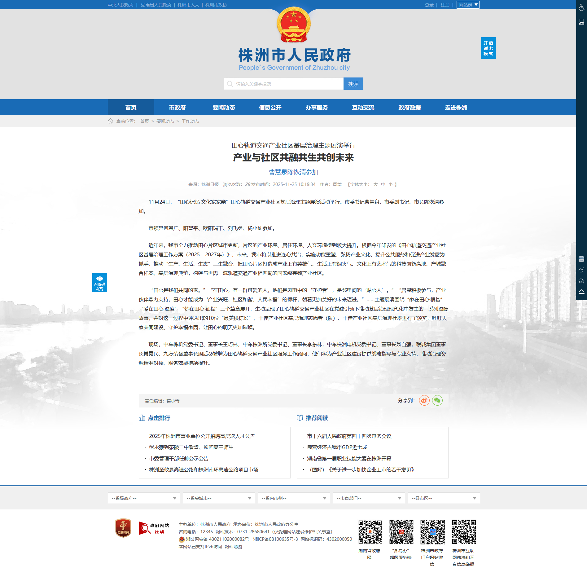 近年来,我市全力推动田心片区城市更新,片区的产业环境、居住环境、人文环境得到较大提升。根据今年印发的《田心轨道交通产业社区基层治理工作方案(2025—2027年)》,未来,我市将以推进连心共治、实施功能重塑、弘扬产业文化、提升公共服务和促进产业发展为抓手,推动“生产、生活、生态”三生融合,把田心片区打造成产业上有英雄气、生活上有烟火气、文化上有艺术气的科技创新高地、产城融合样本、基层治理典范,构建与世界一流轨道交通产业相匹配的国家级完整产业社区。