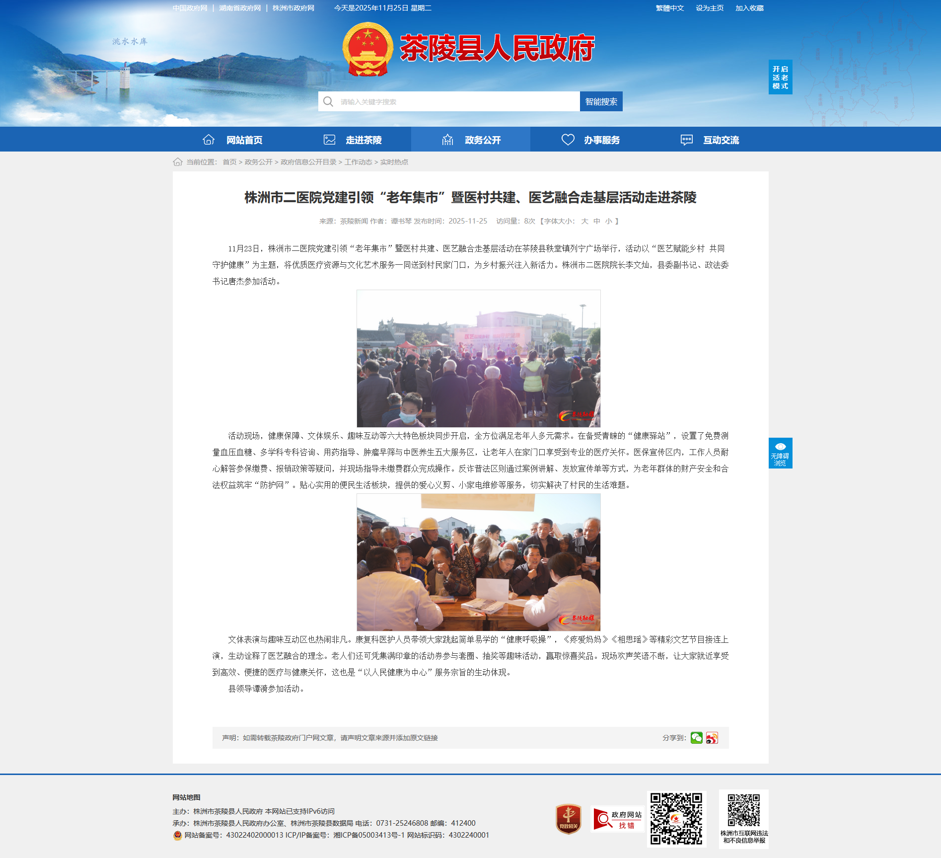 11月23日,株洲市二医院党建引领“老年集市”暨医村共建、医艺融合走基层活动在茶陵县秩堂镇列宁广场举行,活动以“医艺赋能乡村 共同守护健康”为主题,将优质医疗资源与文化艺术服务一同送到村民家门口,为乡村振兴注入新活力。株洲市二医院院长李文灿,县委副书记、政法委书记唐杰参加活动。