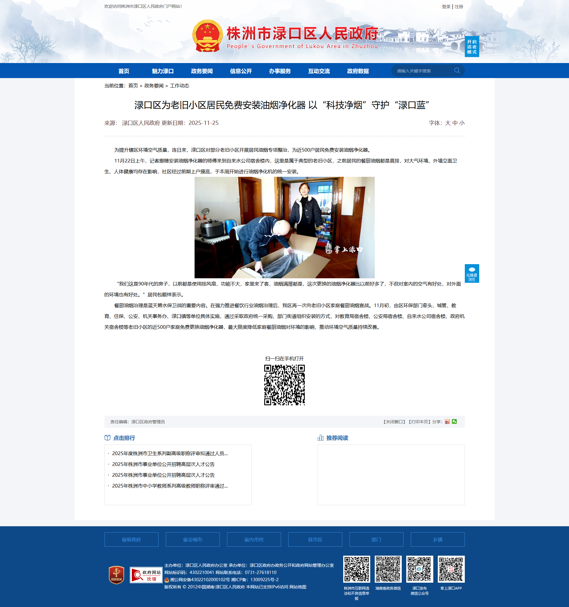 为提升辖区环境空气质量,连日来,渌口区对部分老旧小区开展居民油烟专项整治,为近500户居民免费安装油烟净化器。