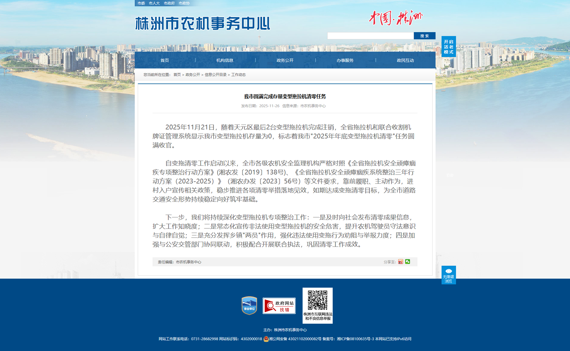 2025年11月21日,随着天元区最后2台变型拖拉机完成注销,全省拖拉机和联合收割机牌证管理系统显示我市变型拖拉机存量为0,标志着我市"2025年年底变型拖拉机清零"任务圆满收官。