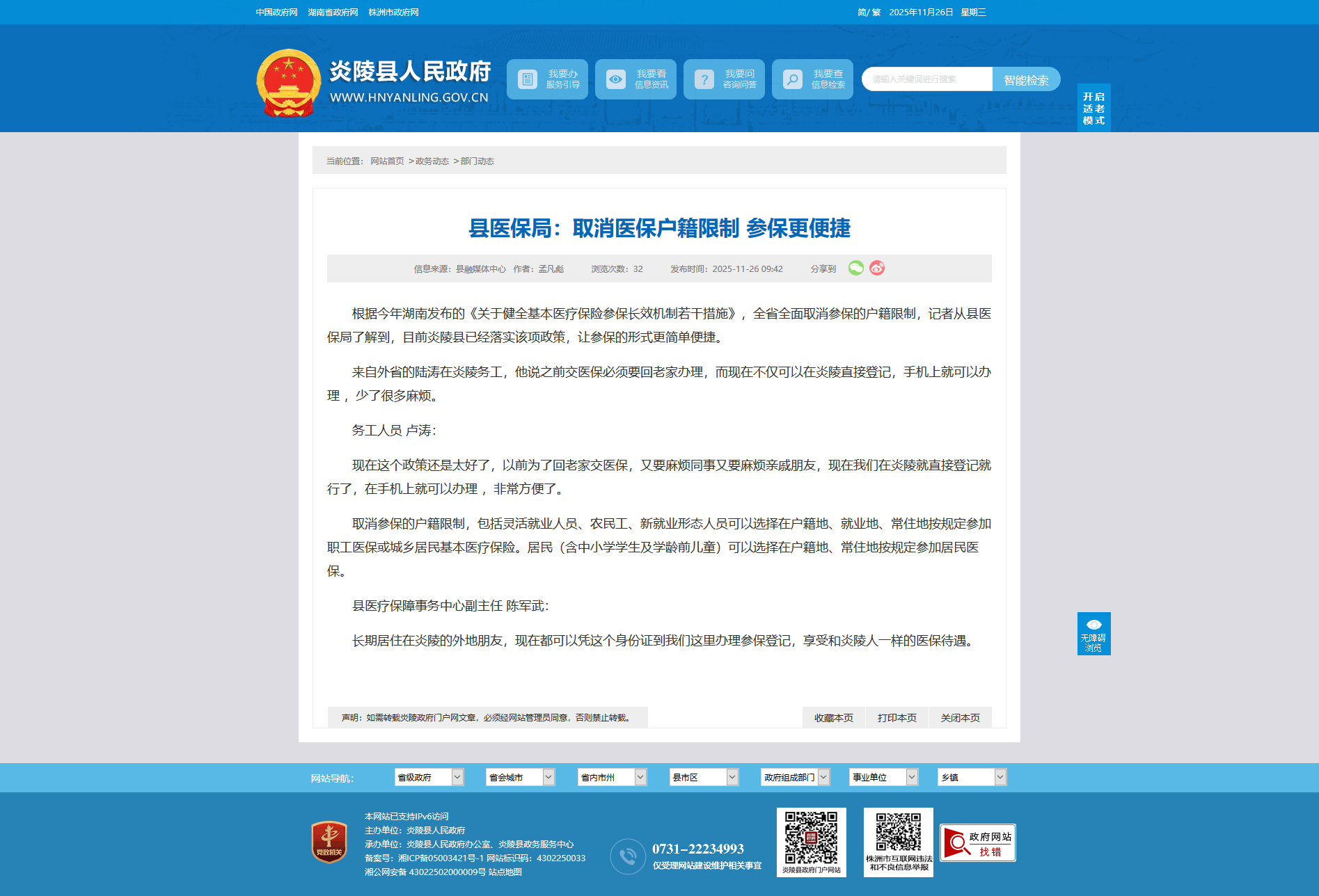 根据今年湖南发布的《关于健全基本医疗保险参保长效机制若干措施》,全省全面取消参保的户籍限制,记者从县医保局了解到,目前炎陵县已经落实该项政策,让参保的形式更简单便捷。