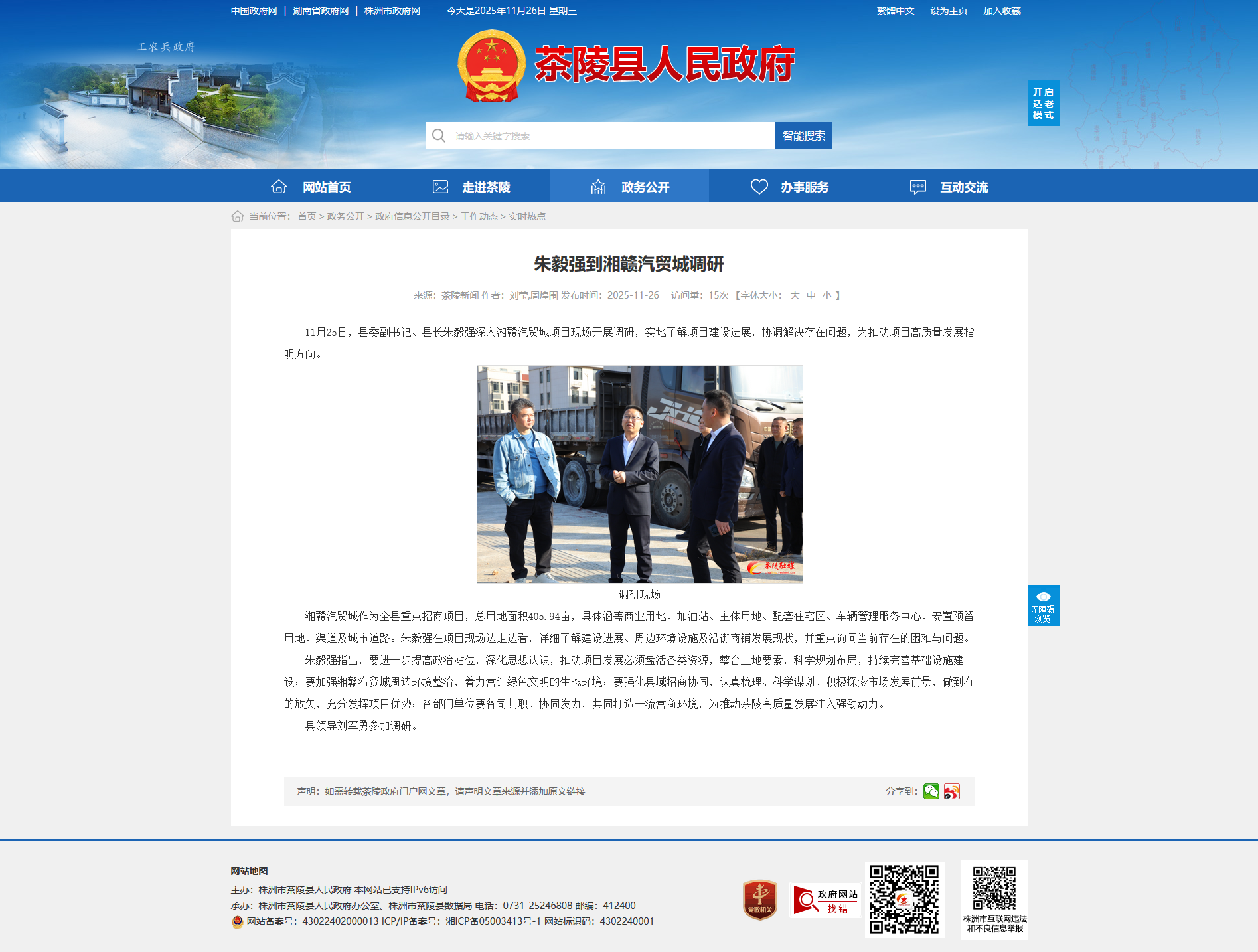 11月25日,县委副书记、县长朱毅强深入湘赣汽贸城项目现场开展调研,实地了解项目建设进展,协调解决存在问题,为推动项目高质量发展指明方向。
