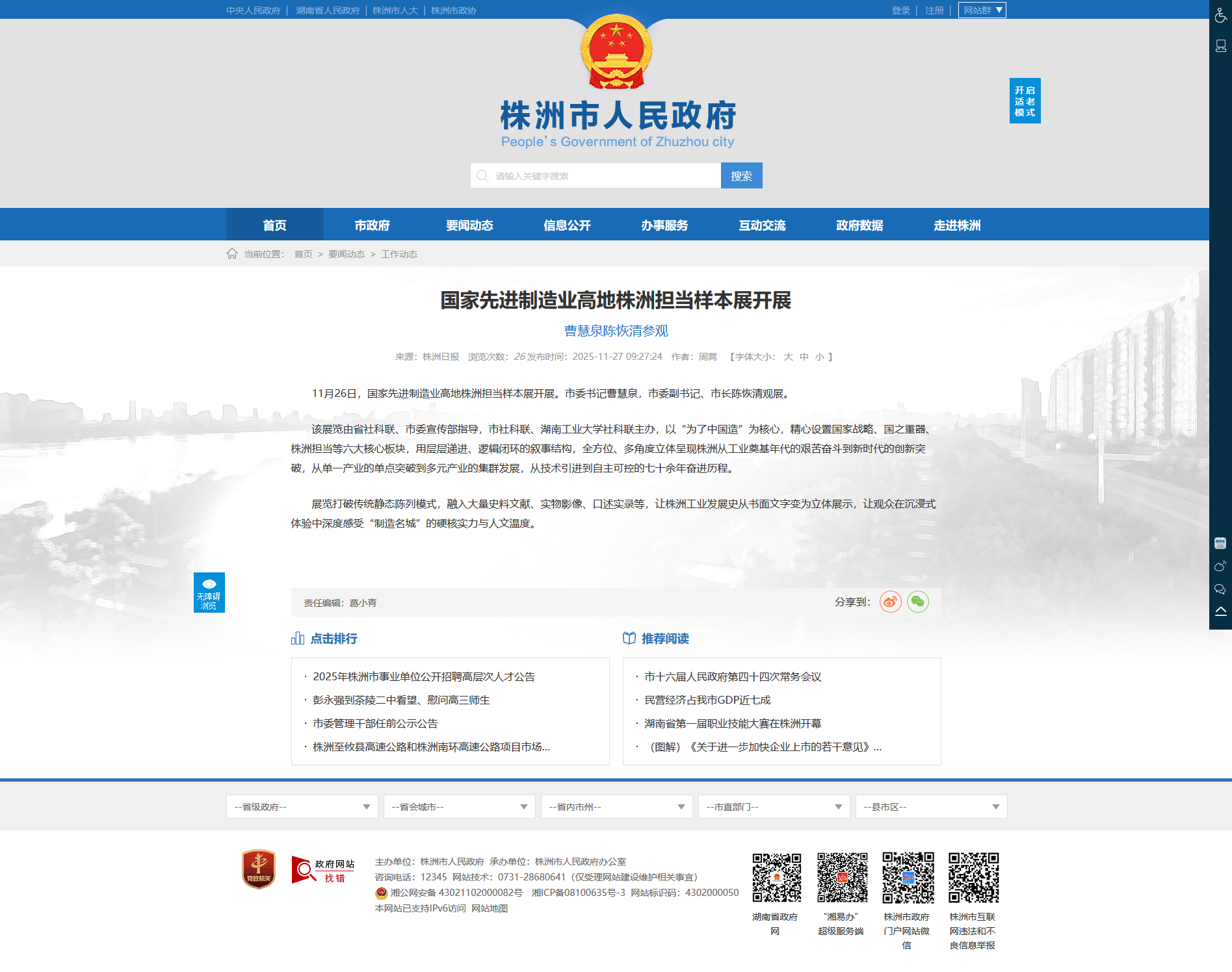 11月26日,国家先进制造业高地株洲担当样本展开展。市委书记曹慧泉,市委副书记、市长陈恢清观展。