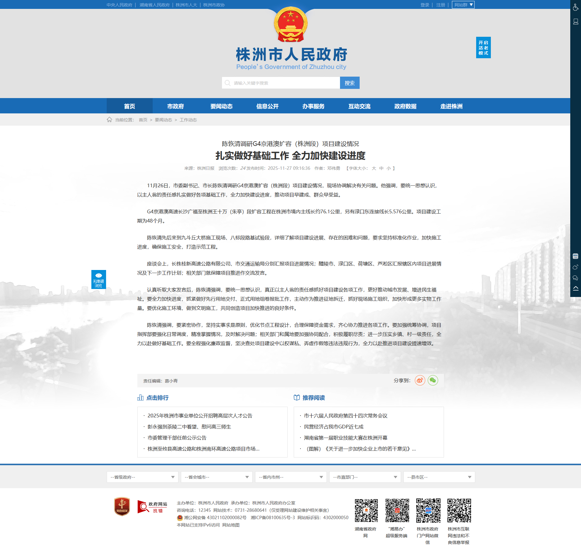 G4京港澳高速长沙广福至株洲王十万(朱亭)段扩容工程在株洲市境内主线长约76.1公里,另有渌口东连接线长5.576公里。项目建设工期为48个月。