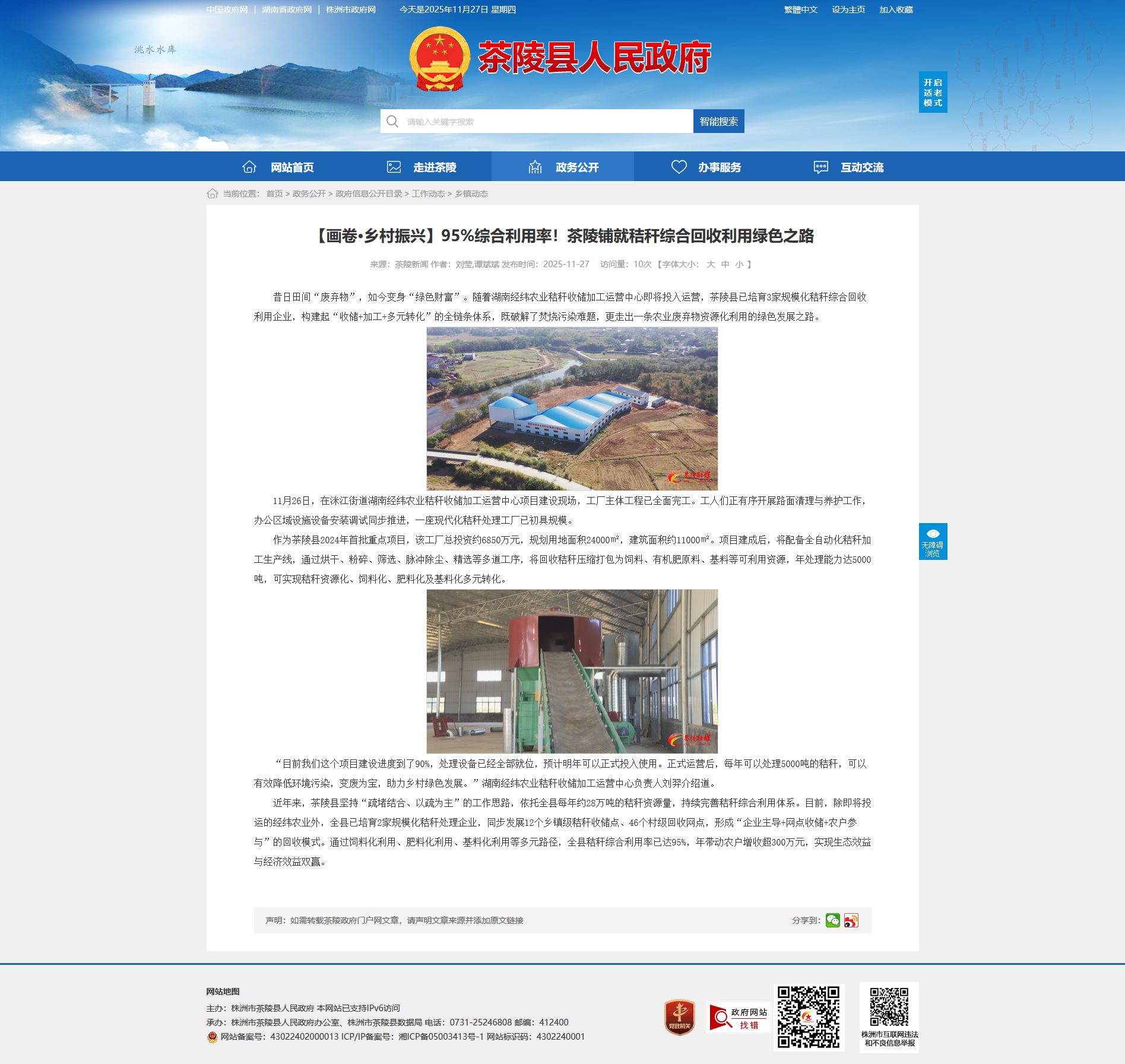 近年来,茶陵县坚持“疏堵结合、以疏为主”的工作思路,依托全县每年约28万吨的秸秆资源量,持续完善秸秆综合利用体系。目前,除即将投运的经纬农业外,全县已培育2家规模化秸秆处理企业,同步发展12个乡镇级秸秆收储点、46个村级回收网点,形成“企业主导 网点收储 农户参与”的回收模式。通过饲料化利用、肥料化利用、基料化利用等多元路径,全县秸秆综合利用率已达95%,年带动农户增收超300万元,实现生态效益与经济效益双赢。