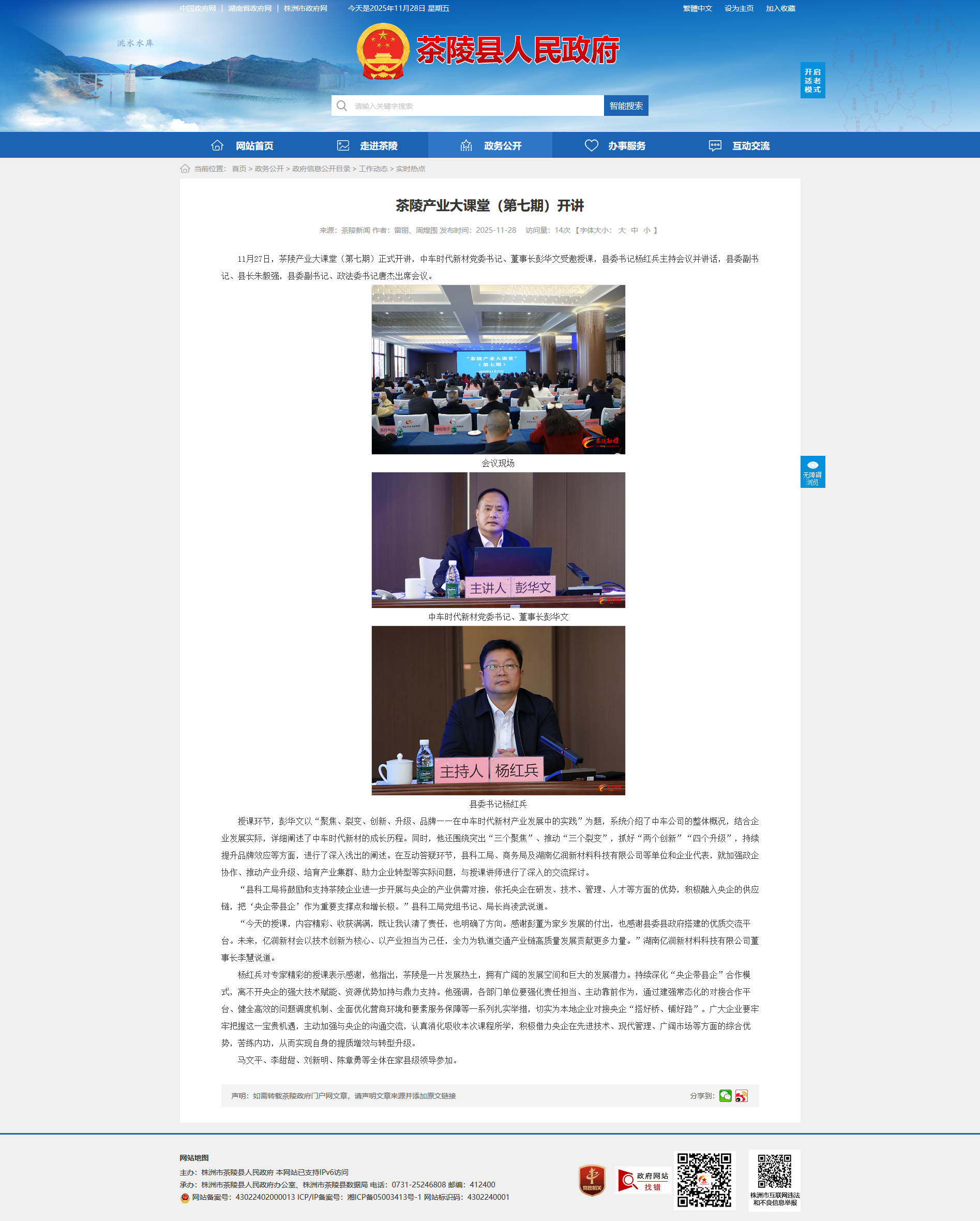 11月27日,茶陵产业大课堂(第七期)正式开讲,中车时代新材党委书记、董事长彭华文受邀授课,县委书记杨红兵主持会议并讲话,县委副书记、县长朱毅强,县委副书记、政法委书记唐杰出席会议。