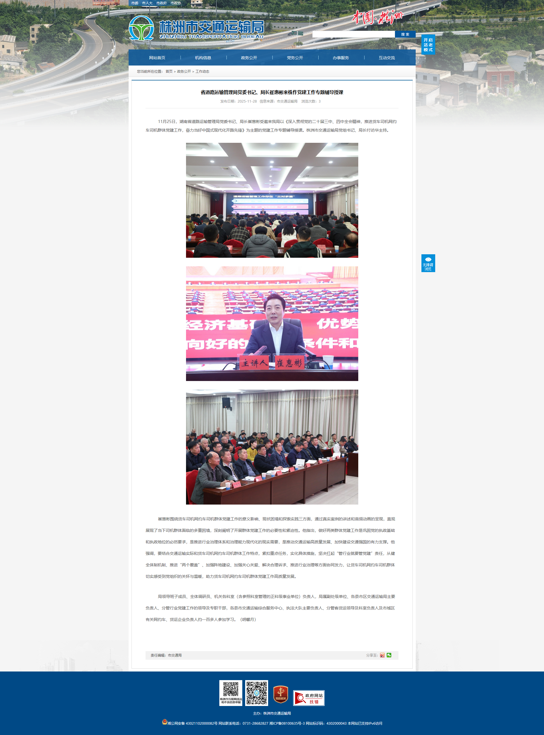11月25日,湖南省道路运输管理局党委书记、局长崔惠彬受邀来我局以《深入贯彻党的二十届三中、四中全会精神,推进货车司机网约车司机群体党建工作,奋力当好中国式现代化开路先锋》为主题的党建工作专题辅导授课。株洲市交通运输局党组书记、局长付访华主持。