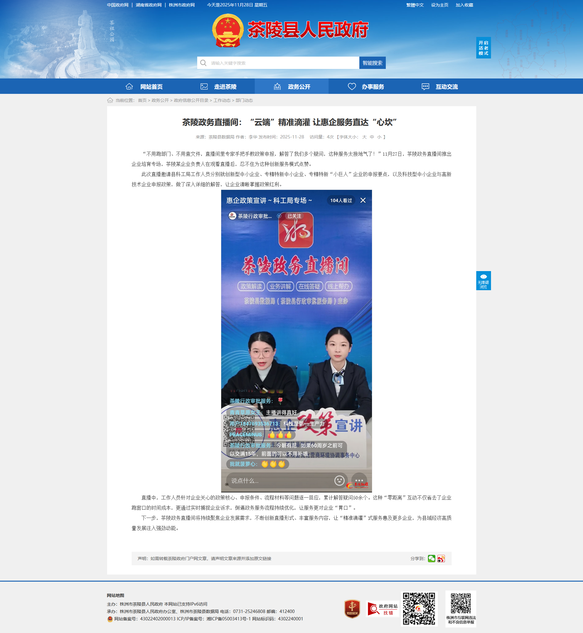 “不用跑部门、不用查文件,直播间里专家手把手教政策申报,解答了我们多个疑问,这种服务太接地气了!”11月27日,茶陵政务直播间推出企业培育专场,茶陵某企业负责人在观看直播后,忍不住为这种创新服务模式点赞。
