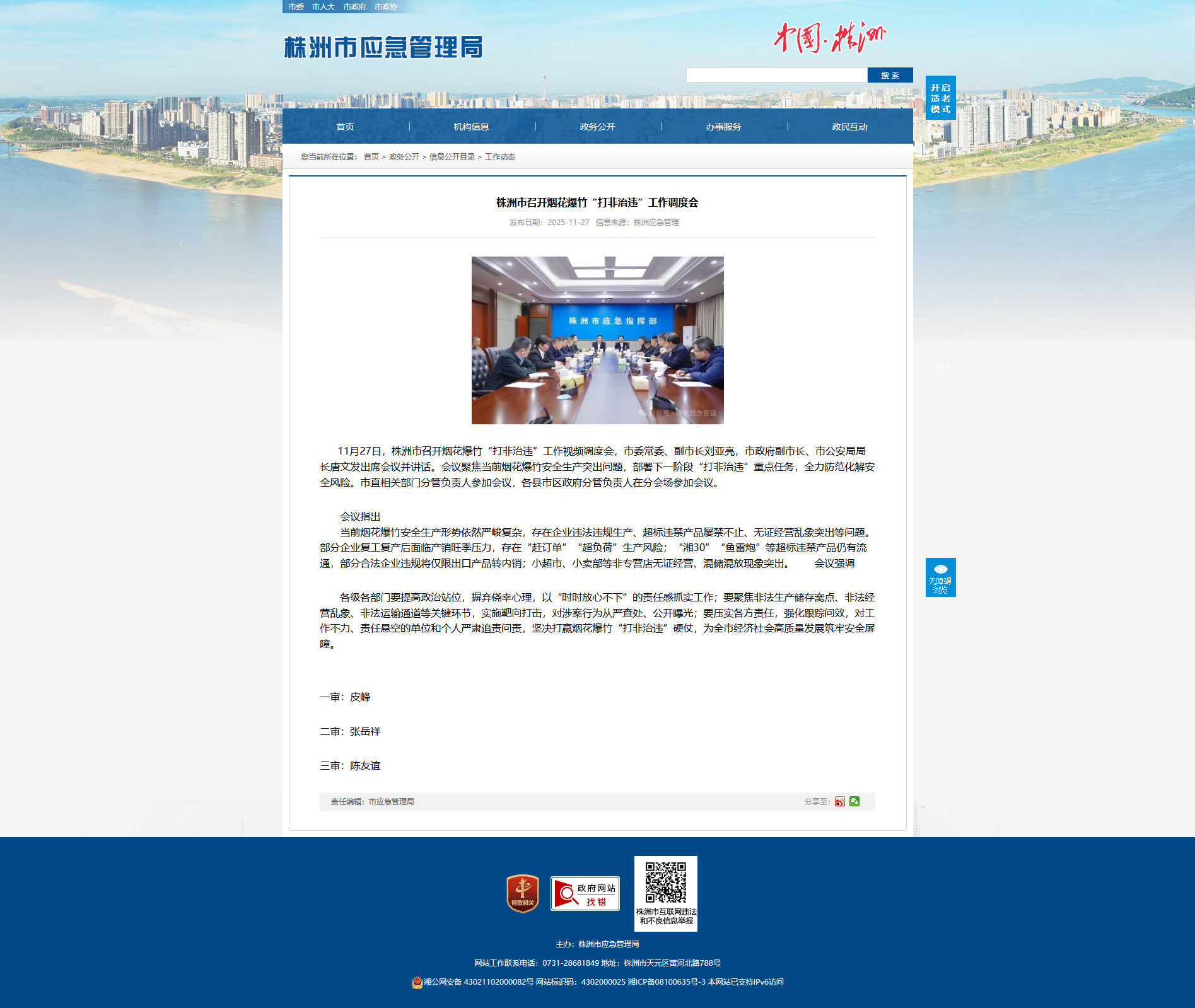 11月27日,株洲市召开烟花爆竹“打非治违”工作视频调度会,市委常委、副市长刘亚亮,市政府副市长、市公安局局长唐文发出席会议并讲话。会议聚焦当前烟花爆竹安全生产突出问题,部署下一阶段“打非治违”重点任务,全力防范化解安全风险。市直相关部门分管负责人参加会议,各县市区政府分管负责人在分会场参加会议。