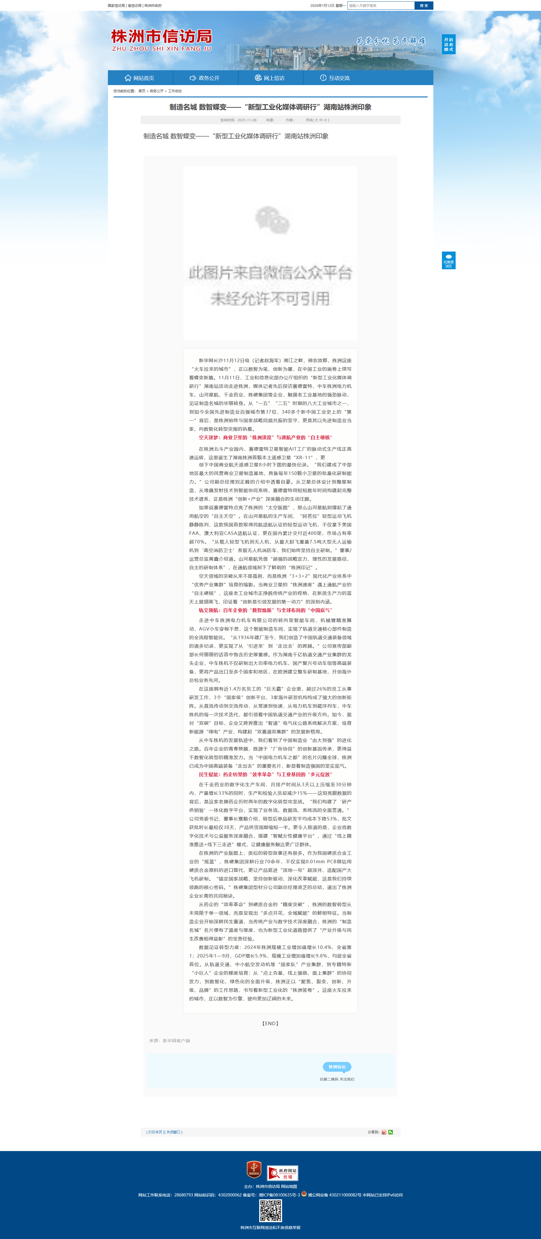 新华网长沙11月12日电(记者赵海军)湘江之畔,神农故郡,株洲这座“火车拉来的城市”,正以数智为笔、创新为墨,在中国工业的画卷上续写着蝶变新篇。11月11日,工业和信息化部办公厅组织的“新型工业化媒体调研行”湖南站活动走进株洲,媒体记者先后探访赛德雷特、中车株洲电力机车、山河星航、千金药业、株硬集团等企业,触摸老工业基地的强劲脉动,见证制造名城的华丽转身。从“一五”“二五”时期的八大工业城市之一,到如今全国先进制造业百强城市第37位,340多个新中国工业史上的“第一”背后,是株洲始终与国家战略同频共振的坚守,更是其以先进制造业当家、向数智化转型突围的执着。