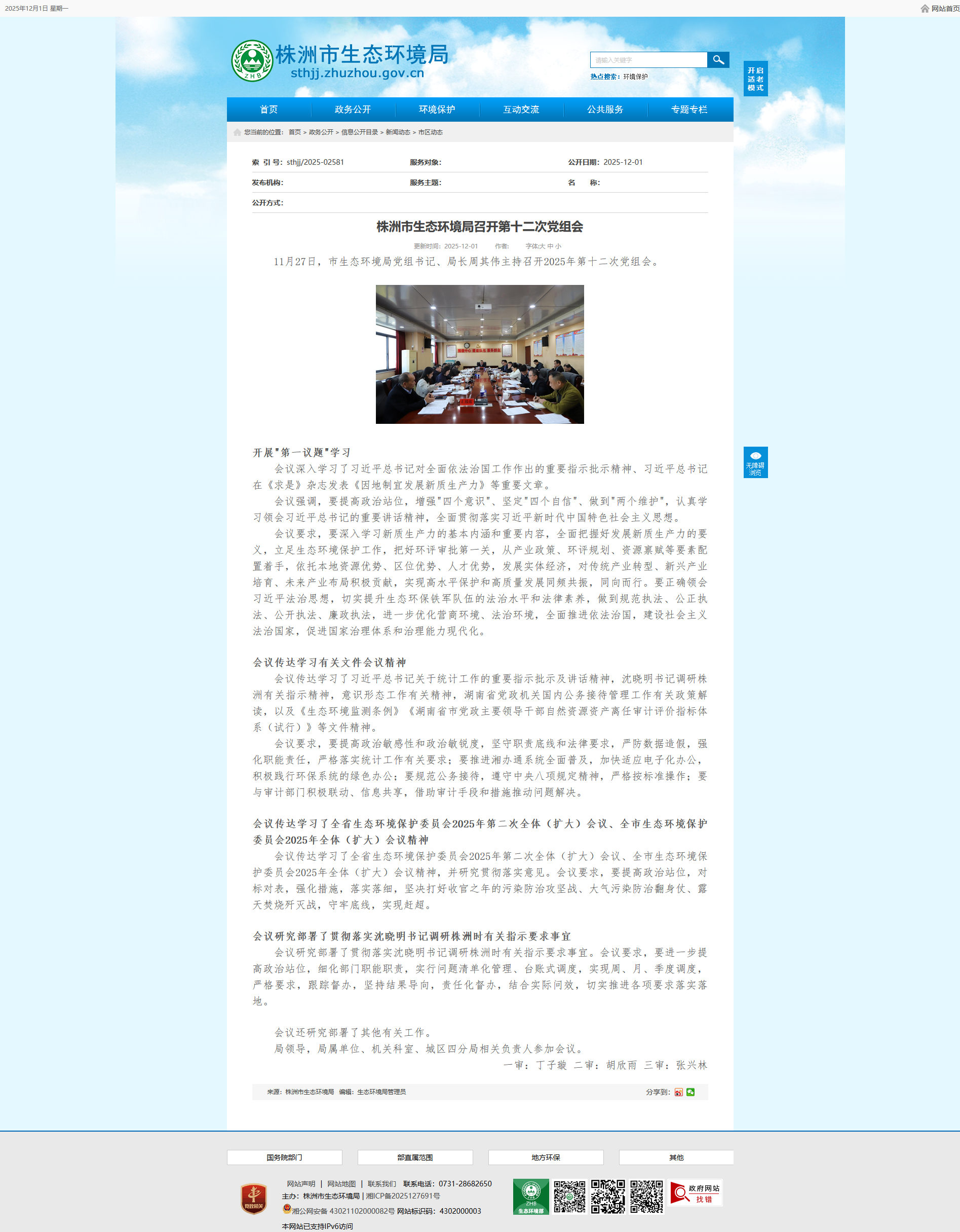 11月27日,市生态环境局党组书记、局长周其伟主持召开2025年第十二次党组会。