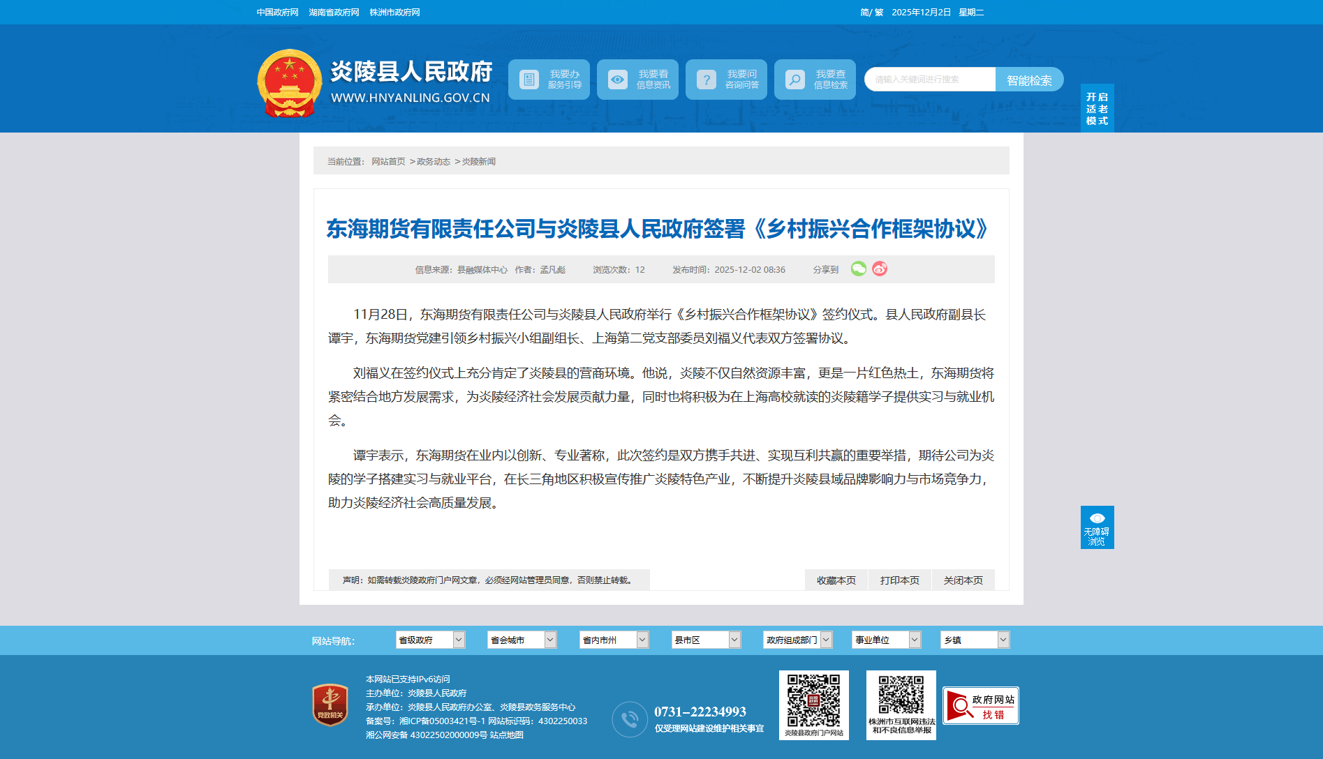 11月28日,东海期货有限责任公司与炎陵县人民政府举行《乡村振兴合作框架协议》签约仪式。县人民政府副县长谭宇,东海期货党建引领乡村振兴小组副组长、上海第二党支部委员刘福义代表双方签署协议。