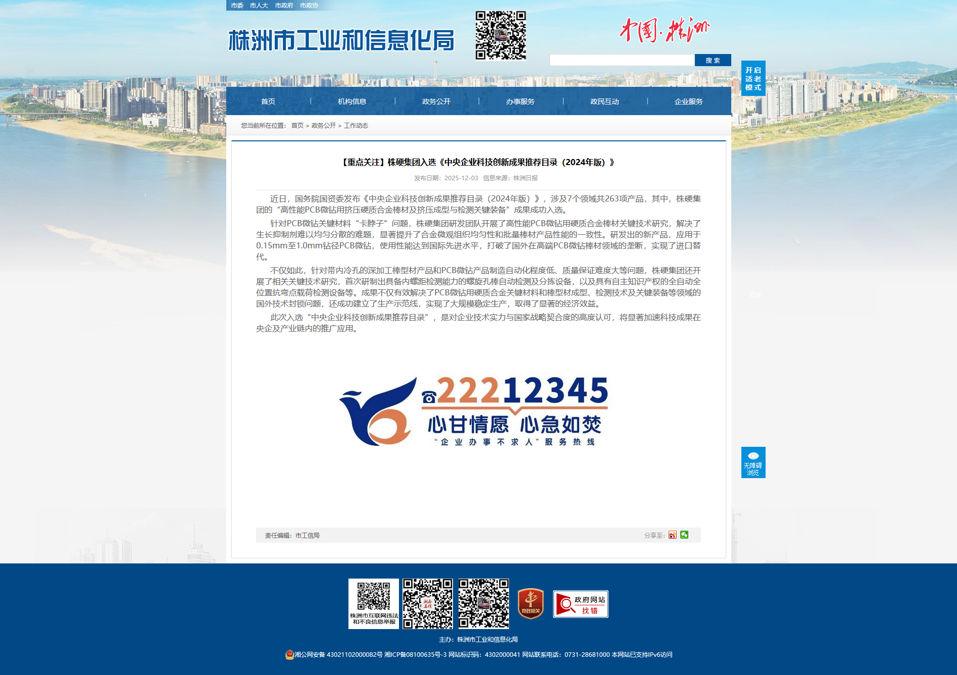 近日,国务院国资委发布《中央企业科技创新成果推荐目录(2024年版)》,涉及7个领域共263项产品,其中,株硬集团的“高性能PCB微钻用挤压硬质合金棒材及挤压成型与检测关键装备”成果成功入选。