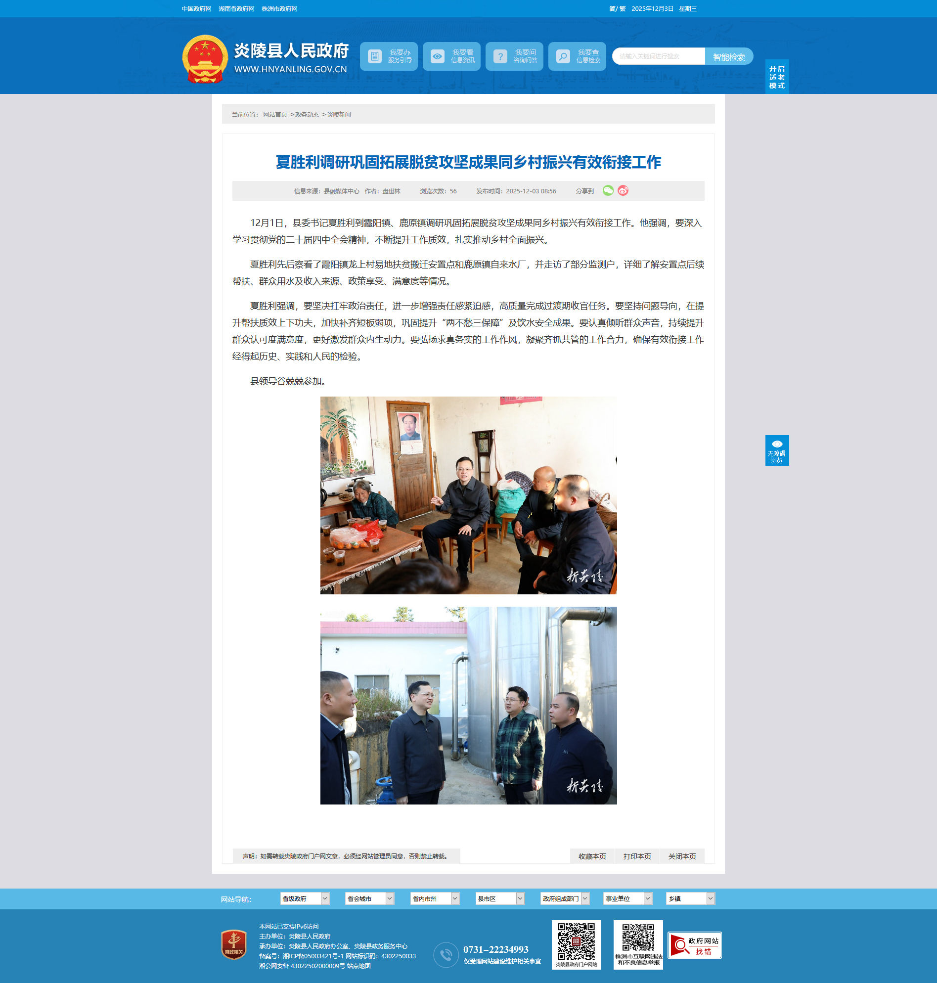 12月1日,县委书记夏胜利到霞阳镇、鹿原镇调研巩固拓展脱贫攻坚成果同乡村振兴有效衔接工作。他强调,要深入学习贯彻党的二十届四中全会精神,不断提升工作质效,扎实推动乡村全面振兴。